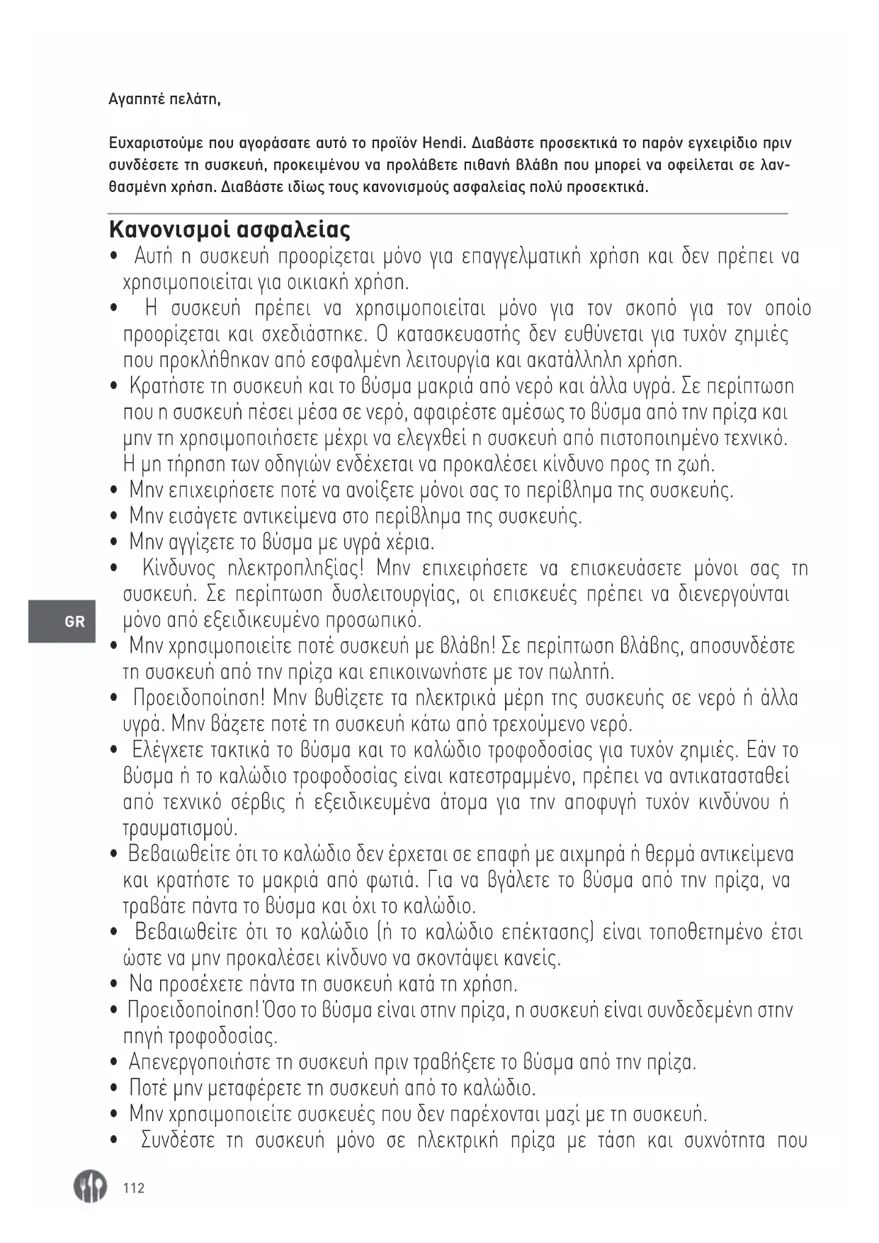 Αγαπητέ πελάτη, Ευχαριστούμε που αγοράσατε αυτό το προϊόν Hendi. Διαβάστε προσεκτικά το παρόν εγχειρίδιο πριν συνδέσετε τη συσκευή, προκειμένου να προλάβετε πιθανή βλάβη που μπορεί να οφείλεται σε λαν- θασμένη χρήση. Διαβάστε ιδίως τους κανονισμούς ασφαλείας πολύ προσεκτικά. Κανονισμοί ασφαλείας