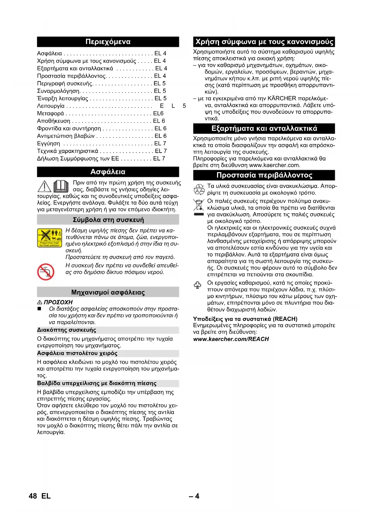 Χρησιμοποιείτε μόνο γνήσια παρελκόμενα και ανταλλα- κτικά τα οποία διασφαλίζουν την ασφαλή και απρόσκο- πτη λειτουργία της συσκευής. Πληροφορίες για παρελκόμενα και ανταλλακτικά θα βρείτε στη διεύθυνση www.kaercher.com. Υποδείξεις για τα συστατικά (REACH) Ενημερωμένες πληροφορίες για τα συστατικά μπορείτε να βρείτε στη διεύθυνση: www.kaercher.com/REACH Περιεχόμενα Ασφάλεια . . . . . . . . . . . . . . . . . . . . . . . . . . . . EL 4 Χρήση σύμφωνα με τους κανονισμούς . . . . . EL 4 Εξαρτήματα και ανταλλακτικά . . . . . . . . . . . . EL 4 Προστασία περιβάλλοντος. . . . . . . . . . . . . . . EL 4 Περιγραφή συσκευής. . . . . . . . . . . . . . . . . . . EL 5 Συναρμολόγηση. . . . . . . . . . . . . . . . . . . . . . . EL 5 Έναρξη λειτουργίας . . . . . . . . . . . . . . . . . . . . EL 5 Λειτουργία . . . . . . . . . . . . . . . . . . . . . . . . . . .EL5 Μεταφορά . . . . . . . . . . . . . . . . . . . . . . . . . . . EL6 Αποθήκευση . . . . . . . . . . . . . . . . . . . . . . . . . EL 6 Φροντίδα και συντήρηση . . . . . . . . . . . . . . . . EL 6 Αντιμετώπιση βλαβών . . . . . . . . . . . . . . . . . . EL 6 Εγγύηση . . . . . . . . . . . . . . . . . . . . . . . . . . . . EL 7 Τεχνικά χαρακτηριστικά . . . . . . . . . . . . . . . . . EL 7 Δήλωση Συμμόρφωσης των ΕE . . . . . . . . . . EL 7