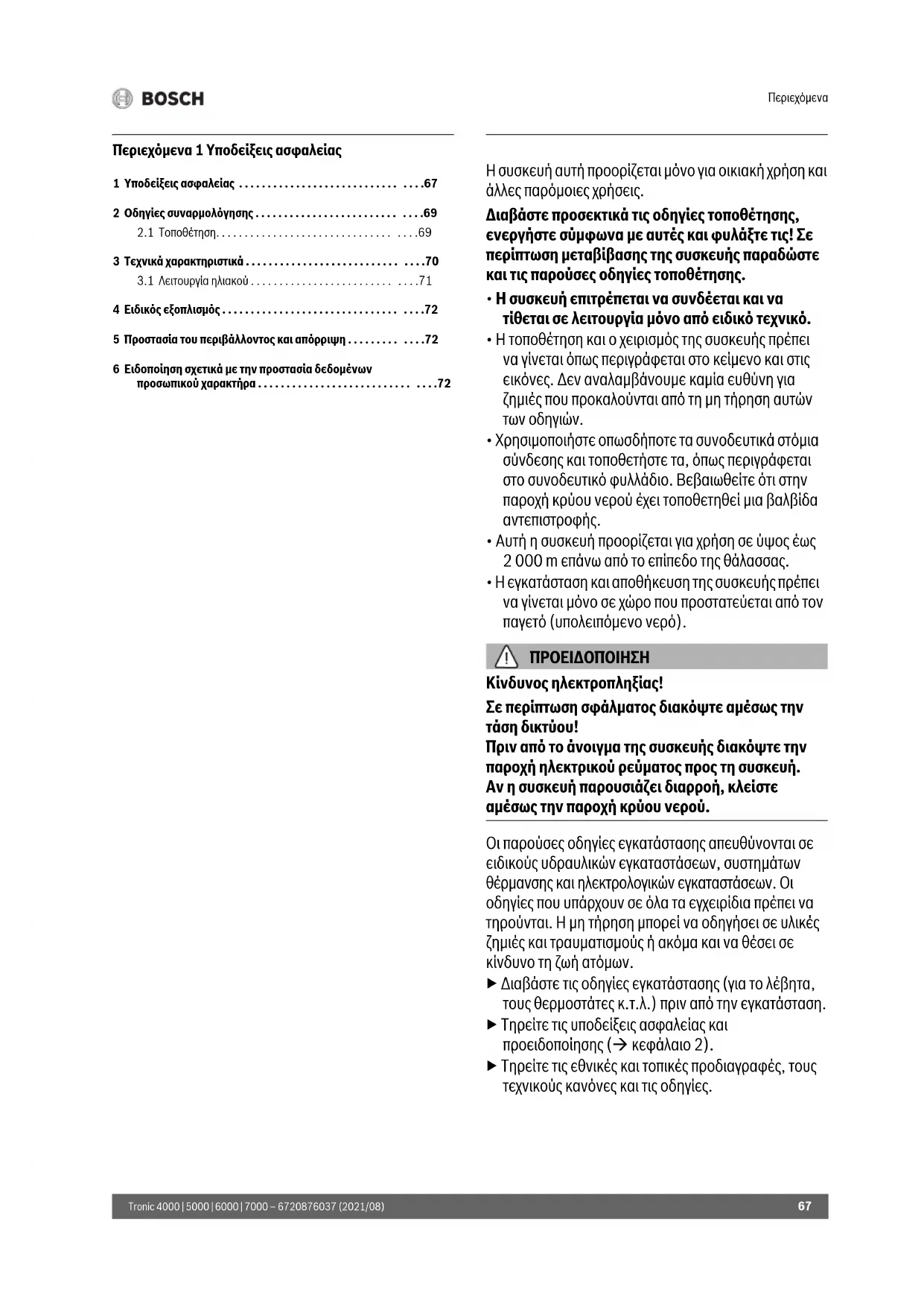 - Η εγκατάσταση και αποθήκευση της συσκευής πρέπει να γίνεται μόνο σε χώρο που προστατεύεται από τον παγετό (υπολειπόμενο νερό). ΠΡΟΕΙΔΟΠΟΙΗΣΗ Κίνδυνος ηλεκτροπληξίας! Σε περίπτωση σφάλματος διακόψτε αμέσως την τάση δικτύου! Πριν από το άνοιγμα της συσκευής διακόψτε την παροχή ηλεκτρικού ρεύματος προς τη συσκευή. Αν η συσκευή παρουσιάζει διαρροή, κλείστε αμέσως την παροχή κρύου νερού. Οι παρούσες οδηγίες εγκατάστασης απευθύνονται σε ειδικούς υδραυλικών εγκαταστάσεων, συστημάτων θέρμανσης και ηλεκτρολογικών εγκαταστάσεων. Οι οδηγίες που υπάρχουν σε όλα τα εγχειρίδια πρέπει να τηρούνται. Η μη τήρηση μπορεί να οδηγήσει σε υλικές ζημιές και τραυματισμούς ή ακόμα και να θέσει σε κίνδυνο τη ζωή ατόμων. ▶ Διαβάστε τις οδηγίες εγκατάστασης (για το λέβητα, τους θερμοστάτες κ.τ.λ.) πριν από την εγκατάσταση. ▶ Τηρείτε τις υποδείξεις ασφαλείας και προειδοποίησης ( κεφάλαιο 2). ▶ Τηρείτε τις εθνικές και τοπικές προδιαγραφές, τους τεχνικούς κανόνες και τις οδηγίες. 1 Υποδείξεις ασφαλείας . . . . . . . . . . . . . . . . . . . . . . . . . . . . . . . .67 2 Οδηγίες συναρμολόγησης . . . . . . . . . . . . . . . . . . . . . . . . . . . . .69