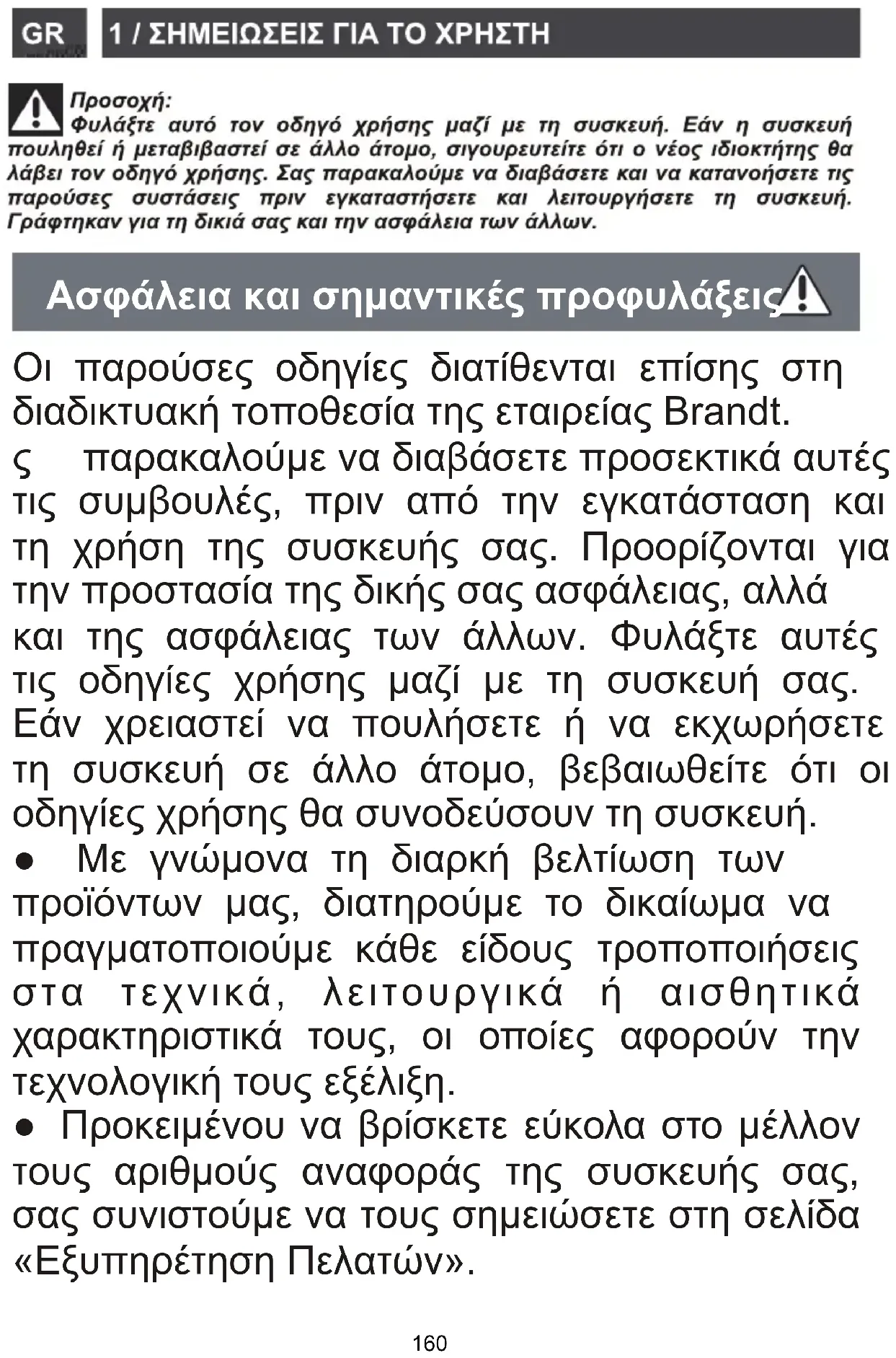 181Ασφάλεια και σημαντικές προφυλάξεις Οι παρούσες οδηγίες διατίθενται επίσης στη διαδικτυακή τοποθεσία της εταιρείας Brandt. ςΣα παρακαλούμε να διαβάσετε προσεκτικά αυτές τις συμβουλές, πριν από την εγκατάσταση και τη χρήση της συσκευής σας. Προορίζονται για την προστασία της δικής σας ασφάλειας, αλλά και της ασφάλειας των άλλων. Φυλάξτε αυτές τις οδηγίες χρήσης μαζί με τη συσκευή σας. Εάν χρειαστεί να πουλήσετε ή να εκχωρήσετε τη συσκευή σε άλλο άτομο, βεβαιωθείτε ότι οι οδηγίες χρήσης θα συνοδεύσουν τη συσκευή. ● Με γνώμονα τη διαρκή βελτίωση των προϊόντων μας, διατηρούμε το δικαίωμα να πραγματοποιούμε κάθε είδους τροποποιήσεις στα τεχνικά, λειτουργικά ή αισθητικά χαρακτηριστικά τους, οι οποίες αφορούν την τεχνολογική τους εξέλιξη. ● Προκειμένου να βρίσκετε εύκολα στο μέλλον τους αριθμούς αναφοράς της συσκευής σας, σας συνιστούμε να τους σημειώσετε στη σελίδα «Εξυπηρέτηση Πελατών». 160Σημαντικές προφυλάξεις ● Η συσκευή αυτή έχει σχεδιαστεί για να χρησιμοποιείται από ιδιώτες στον χώρο κατοικίας τους. Μην τη χρησιμοποιείτε για εμπορικούς ή βιομηχανικούς σκοπούς ή για σκοπούς διαφορετικούς από αυτόν για τον οποίο σχεδιάστηκε. ● Κατά την παραλαβή της συσκευής, αφαιρέστε τη συσκευασία ή φροντίστε να αφαιρεθεί η συσκευασία αμέσως. Ελέγξτε τη γενική της κατάσταση. Διατυπώστε γραπτώς ενδεχόμενες επιφυλάξεις στο δ ε λ τ ί ο παράδοσης, του οποίου θα κρατήσετε ένα