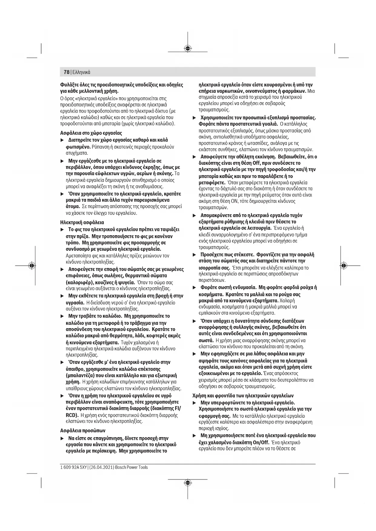 Διαβάστε όλες τις υποδείξεις ασφαλείας, οδηγίες, εικονογραφήσεις και όλα τα τεχνικά στοιχεία, που συνοδεύουν αυτό το ηλεκτρικό εργαλείο. Αμέλειες κατά την τήρηση των ακόλουθων υποδείξεων μπορεί να προκαλέσουν ηλεκτροπληξία, πυρκαγιά και/ή σοβαρούς τραυματισμούς. Bosch Power Tools 1 609 92A 5XY | (26.04.2021)78 | Ελληνικά Φυλάξτε όλες τις προειδοποιητικές υποδείξεις και οδηγίες για κάθε μελλοντική χρήση. Ο όρος «ηλεκτρικό εργαλείο» που χρησιμοποιείται στις προειδοποιητικές υποδείξεις αναφέρεται σε ηλεκτρικά εργαλεία που τροφοδοτούνται από το ηλεκτρικό δίκτυο (με ηλεκτρικό καλώδιο) καθώς και σε ηλεκτρικά εργαλεία που τροφοδοτούνται από μπαταρία (χωρίς ηλεκτρικό καλώδιο). Ασφάλεια στο χώρο εργασίας u Διατηρείτε τον χώρο εργασίας καθαρό και καλά φωτισμένο. Ρύπανση ή σκοτεινές περιοχές προκαλούν