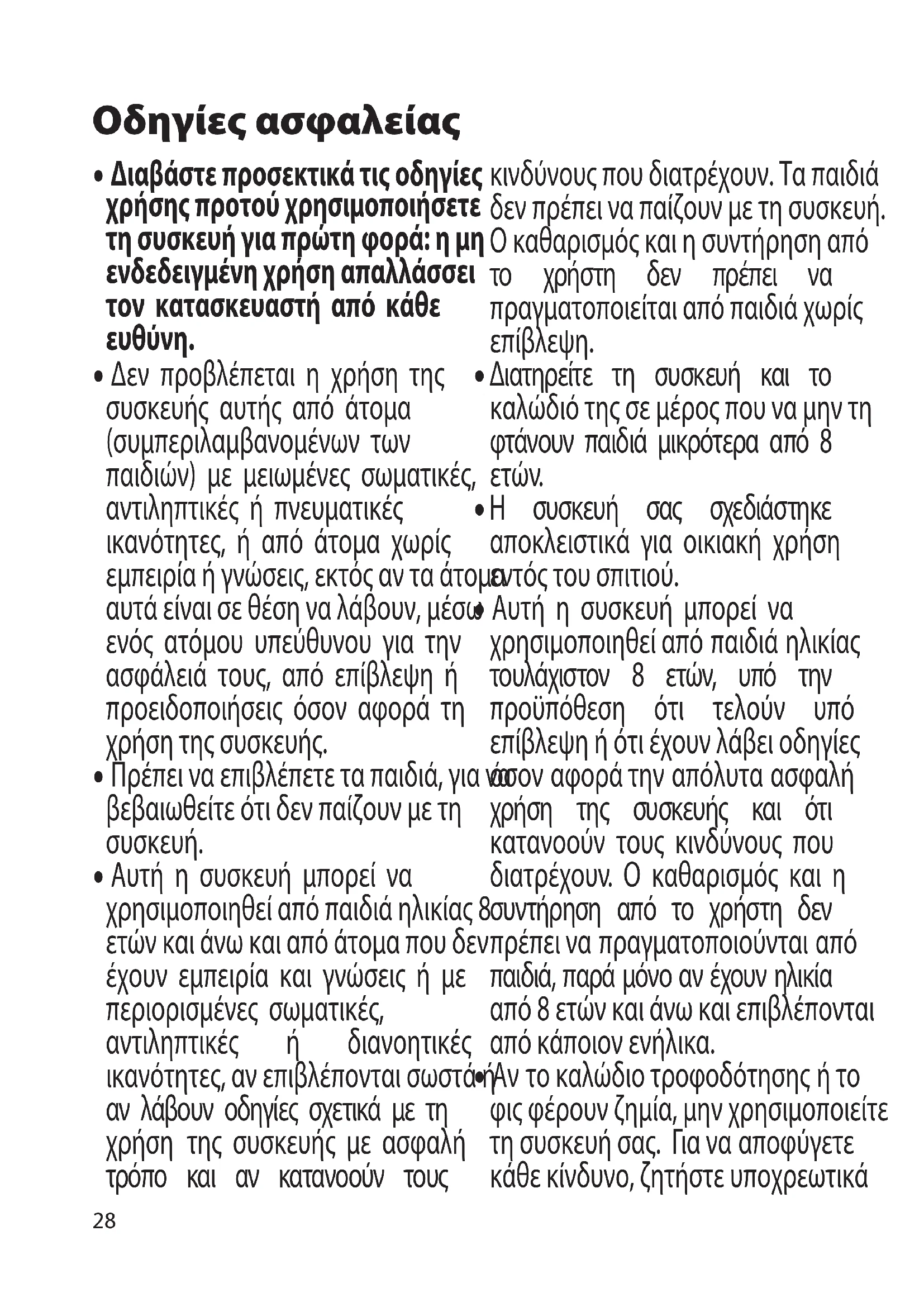 - Αυτή η συσκευή μπορεί να χρησιμοποιηθεί από παιδιά ηλικίας τουλάχιστον 8 ετών, υπό την προϋπόθεση ότι τελούν υπό επίβλεψη ή ότι έχουν λάβει οδηγίες όσον αφορά την απόλυτα ασφαλή χρήση της συσκευής και ότι κατανοούν τους κινδύνους που διατρέχουν. Ο καθαρισμός και η συντήρηση από το χρήστη δεν πρέπει να πραγματοποιούνται από παιδιά, παρά μόνο αν έχουν ηλικία από 8 ετών και άνω και επιβλέπονται από κάποιον ενήλικα.