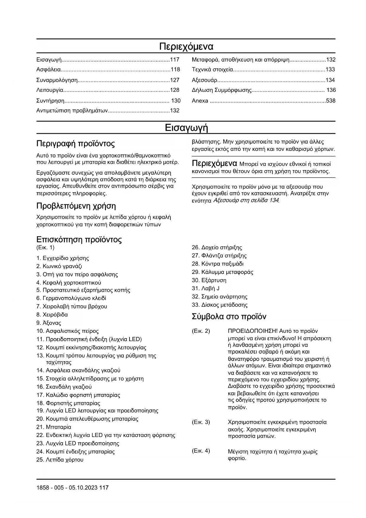 Βεβαιωθείτε ότι όλα τα χειριστήρια λειτουργούν και δεν έχουν υποστεί ζημιά. X Διατηρήστε τις λαβές στεγνές, καθαρές και χωρίς λάδια ή γράσο. X 130 1858 - 005 - 05.10.2023Συντήρηση
