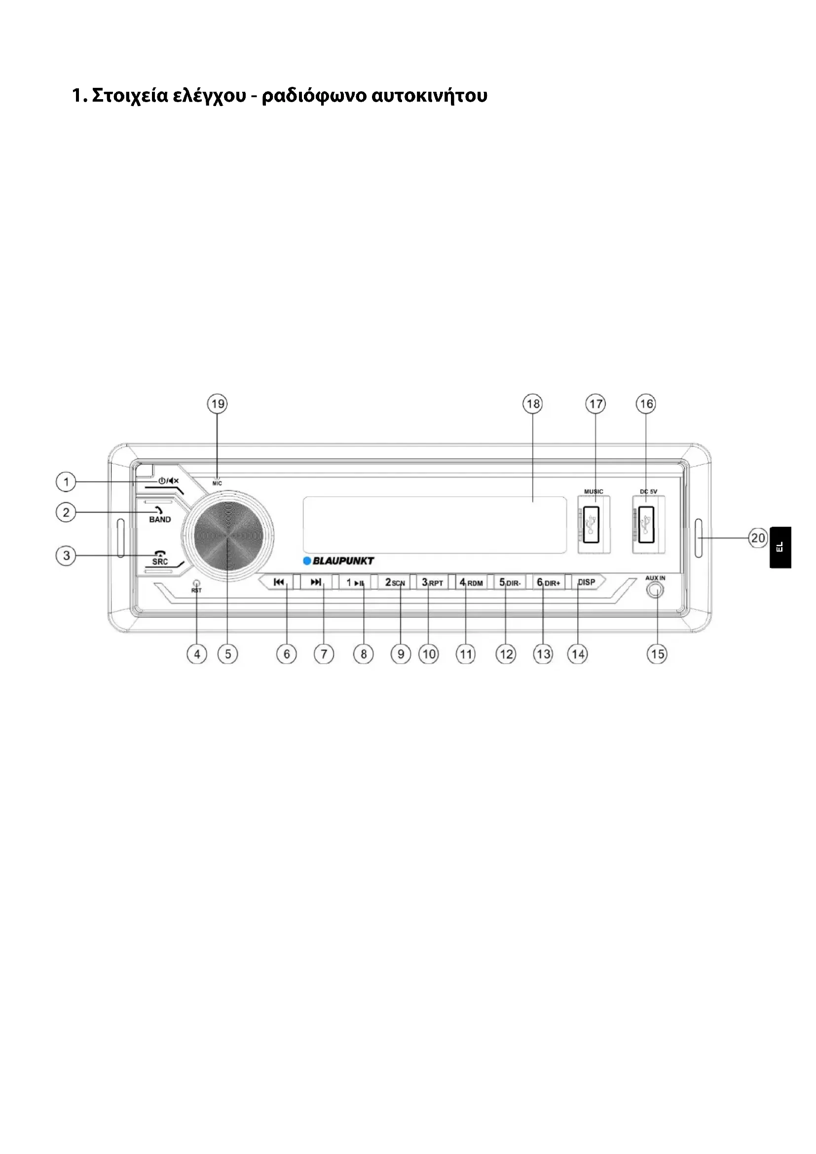Σύντομο πάτημα: Ενεργοποίηση ραδιοφώνου αυτοκινήτου, σίγαση ραδιοφώνου αυτοκινήτου Παρατεταμένο πάτημα: Απενεργοποίηση ραδιοφώνου αυτοκινήτου ② BAND/Λήψη κλήσης Αλλαγή του επιπέδου μνήμης, λήψη εισερχόμενης κλήσης, κλήση του τελευταίου αριθμού ③ Κουμπί SRC/απόρριψηκλήσης, τερματισμός κλήσης: Επιλογή πηγής ήχου, οι διαθέσιμες πηγές ήχου αλλάζουν μία προς μία. Κατά τη διάρκεια της κλήσης: Απόρριψη κλήσης, τερματισμός κλήσης ④ Κουμπί RST: Reset: Επαναφορά της συσκευής ⑤ Περιστρεφόμενο κουμπί: Περιστροφή: Ένταση ήχου δυνατά/ χαμηλά Στο μενού, εναλλαγή μεταξύ των επιλογών ρύθμισης/ αλλαγή επιλογής Σύντομο πάτημα: Κλήση των ρυθμίσεων ήχου (βλ. ΡΥΘΜΙΣΕΙΣ | MENU) Παρατεταμένο πάτημα: Κλήση προηγμένων ρυθμίσεων (βλ. ΡΥΘΜΙΣΕΙΣ | ΜΕΝΟΥ) ⑥ ⑦Κουμπιά εμπρός/πίσω: Σύντομο πάτημα: Ανάλογα με την πηγή, αναζήτηση FM, αλλαγή υπηρεσίας DAB (μόνο BPA 1124 DAB BT), αλλαγή κομματιού USB/Bluetooth κ.λπ. Παρατεταμένο πάτημα: Ανάλογα με την πηγή: FM: Χειροκίνητη αναζήτηση DAB: Αναζήτηση ζώνης (μόνο BPA 1124 DAB BT) USB: Γρήγορη προώθηση προς τα εμπρός/προς τα πίσω ⑧-⑬Κουμπιά ραδιοφωνικών σταθμών: Σύντομο πάτημα: Κλήση ενός σταθμού ή μιας δεύτερης λειτουργίας/ειδικής λειτουργίας που εμφανίζεται ανάλογα με την επιλεγμένη πηγή (αναπαραγωγή/παύση, λειτουργία αναπαραγωγής SCN, λειτουργία επανάληψης RPT, τυχαία αναπαραγωγή RDM, Παρατεταμένο πάτημα: Αποθήκευση του τρέχοντος ραδιοφωνικού σταθμού ⑫-⑬Κουμπιά DIR-/ DIR+ : Σύντομο πάτημα: Αλλαγή καταλόγου κατά την αναπαραγωγή μέσω USB Παρατεταμένο πάτημα: 10 τίτλοι προς τα πίσω/προς τα εμπρός κατά την αναπαραγωγή μέσω USB ⑭ Κουμπί DISP: Σύντομο πάτημα: Εναλλαγή της οθόνης μεταξύ διαφορετικών πληροφοριών ανάλογα με την επιλεγμένη πηγή Παρατεταμένο πάτημα: Ρύθμιση ώρας ⑮ Είσοδος AUX-IN : Υποδοχή για εξωτερική αναλογική πηγή ήχου με στερεοφωνικό βύσμα 3,5 mm ⑯ Υποδοχή USB DC 5V: Υποδοχή για συσκευές φόρτισης, όπως κινητά τηλέφωνα (max. 2A) ⑰ Υποδοχή USB MUSIC: Υποδοχή για στικάκια USB για αναπαραγωγή μουσικής (FAT/exFAT) ⑱ Οθόνη LC: Εμφάνιση πληροφοριών όπως σταθμός, μουσικό κομμάτι, ώρα και επιλογές ρυθμίσεων ⑲ MIC Μικρόφωνο : (μικρόφωνο hands-free) ⑳ Οπές για το εργαλείο αποσυναρμολόγησηςEL