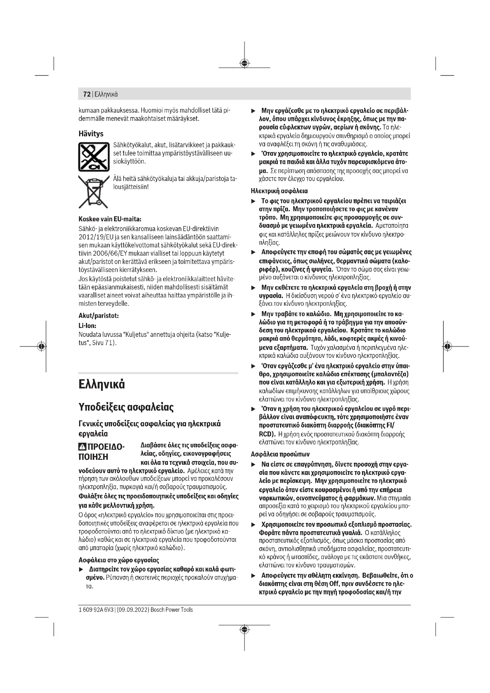 u Χρησιμοποιείτε τα ηλεκτρικά εργαλεία μόνο με τις ειδι- κά σχεδιασμένες μπαταρίες. Η χρήση άλλων μπαταριών μπορεί να οδηγήσει σε τραυματισμούς και να δημιουργήσει κίνδυνο πυρκαγιάς. u Όταν η μπαταρία δε χρησιμοποιείται, κρατήστε την μα- κριά από άλλα μεταλλικά αντικείμενα, όπως συνδετή- ρες χαρτιών, νομίσματα, κλειδιά, καρφιά, βίδες ή άλλα μικρά μεταλλικά αντικείμενα που μπορούν να βραχυκυ- κλώσουν τις επαφές της μπαταρίας. Ένα βραχυκύκλωμα των επαφών της μπαταρίας μπορεί να προκαλέσει τραυματι- σμούς ή φωτιά. u Μια τυχόν εσφαλμένη χρήση μπορεί να οδηγήσει σε διαρροή υγρών από την μπαταρία. Αποφεύγετε κάθε επαφή μ’ αυτά. Σε περίπτωση τυχαίας επαφής ξεπλύνε- τε καλά με νερό. Εάν τα υγρά έρθουν σε επαφή με τα μάτια, ζητήστε επιπλέον ιατρική βοήθεια. Διαρρέοντα υγρά μπαταρίας μπορεί να οδηγήσουν σε ερεθισμούς του δέρματος ή σε εγκαύματα. u Μην χρησιμοποιείτε μπαταρία ή εργαλείο που είναι κα- τεστραμμένο ή τροποποιημένο. Οι χαλασμένες ή τροπο- ποιημένες μπαταρίες μπορεί να παρουσιάσουν μια απρόβλεπτη συμπεριφορά και να οδηγήσουν σε φωτιά, έκρηξη ή σε κίνδυνο τραυματισμού. u Μην εκθέτετε μια μπαταρία ή ένα εργαλείο μπαταρίας σε φωτιά ή σε πολύ υψηλές θερμοκρασίες. Η έκθεση στη φωτιά ή σε θερμοκρασία πάνω από τους 130 °C μπορεί να προκαλέσει έκρηξη. Bosch Power Tools 1 609 92A 6V3 | (09.09.2022)74 | Ελληνικά u Τηρείτε όλες τις υποδείξεις για τη φόρτιση και μη φορ- τίζετε την μπαταρία ή το εργαλείο μπαταρίας ποτέ εκτός της περιοχής θερμοκρασίας που αναφέρεται στις οδηγίες λειτουργίας. Η λάθος φόρτιση ή η φόρτιση εκτός της επιτρεπτής περιοχής θερμοκρασίας μπορεί να κατα- στρέψει την μπαταρία και να αυξήσει τον κίνδυνο πυρκα-
