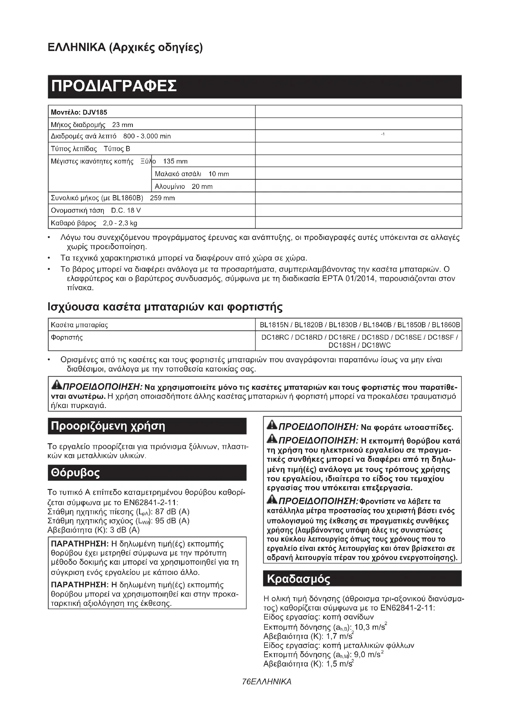 - Ορισμένεςαπότιςκασέτεςκαιτουςφορτιστέςμπαταριώνπουαναγράφονταιπαραπάνωίσωςναμηνείναι διαθέσιμοι,ανάλογαμετηντοποθεσίακατοικίαςσας. ΠΡΟΕΙΔΟΠΟΙΗΣΗ: Να χρησιμοποιείτε μόνο τις κασέτες μπαταριών και τους φορτιστές που παρατίθε- νται ανωτέρω.Ηχρήσηοποιασδήποτεάλληςκασέταςμπαταριώνήφορτιστήμπορείναπροκαλέσειτραυματισμό ή/καιπυρκαγιά. Προοριζόμενη χρήση Τοεργαλείοπροορίζεταιγιαπριόνισμαξύλινων,πλαστι- κώνκαιμεταλλικώνυλικών.