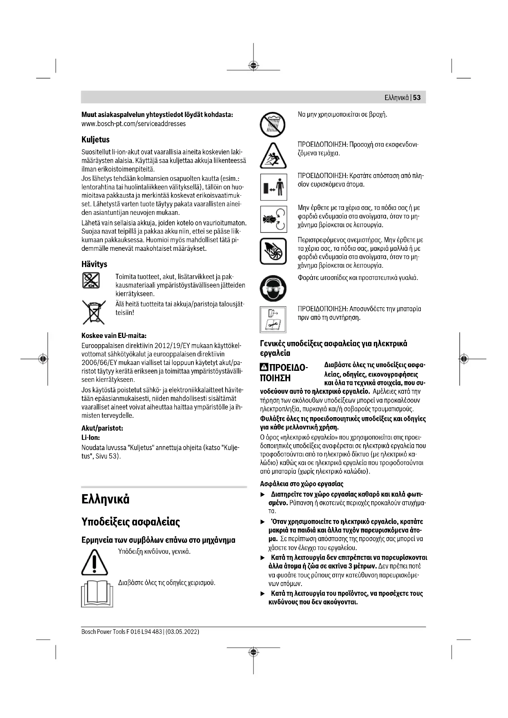 u Όταν χρησιμοποιείτε το ηλεκτρικό εργαλείο, κρατάτε μακριά τα παιδιά και άλλα τυχόν παρευρισκόμενα άτο- μα. Σε περίπτωση απόσπασης της προσοχής σας μπορεί να χάσετε τον έλεγχο του εργαλείου. u Κατά τη λειτουργία δεν επιτρέπεται να παρευρίσκονται άλλα άτομα ή ζώα σε ακτίνα 3μέτρων. Δεν πρέπει ποτέ να φυσάτε τους ρύπους στην κατεύθυνση παρευρισκόμε- νων ατόμων. u Κατά τη λειτουργία του προϊόντος, να προσέχετε τους κινδύνους που δεν ακούγονται. Bosch Power Tools F 016 L94 483 | (03.05.2022)54 | Ελληνικά u Προσέξτε επίσης να μην σκοντάψετε στο μηχάνημα, όταν το ακουμπήσετε κάτω. u Ο χειριστής ευθύνεται για τυχόν ατυχήματα ή ζημιές σε ανθρώπους ή την περιουσία τους. Ηλεκτρική ασφάλεια u Αποφεύγετε την επαφή του σώματός σας με γειωμένες επιφάνειες, όπως σωλήνες, θερμαντικά σώματα (καλο- ριφέρ), κουζίνες ή ψυγεία. Όταν το σώμα σας είναι γειω- μένο αυξάνεται ο κίνδυνος ηλεκτροπληξίας. u Μην εκθέτετε το ηλεκτρικό εργαλείο στη βροχή ή στην υγρασία. Η διείσδυση νερού σ’ ένα ηλεκτρικό εργαλείο αυ- ξάνει τον κίνδυνο ηλεκτροπληξίας. u Αποφεύγετε τις κακές καιρικές συνθήκες, ιδίως αν υπάρχει κίνδυνος καταιγίδας. Ασφάλεια προσώπων u Να είστε σε επαγρύπνηση, δίνετε προσοχή στην εργα- σία που κάνετε και χρησιμοποιείτε το ηλεκτρικό εργα- λείο με περίσκεψη. Μην χρησιμοποιείτε το ηλεκτρικό εργαλείο όταν είστε κουρασμένοι ή υπό την επήρεια ναρκωτικών, οινοπνεύματος ή φαρμάκων. Μια στιγμιαία απροσεξία κατά το χειρισμό του ηλεκτρικού εργαλείου μπο- ρεί να οδηγήσει σε σοβαρούς τραυματισμούς. u Χρησιμοποιείτε τον προσωπικό εξοπλισμό προστασίας. Φοράτε πάντα προστατευτικά γυαλιά. Ο κατάλληλος προστατευτικός εξοπλισμός, όπως μάσκα προστασίας από σκόνη, αντιολισθητικά υποδήματα ασφαλείας, προστατευτι- κό κράνος ή ωτασπίδες, ανάλογα με τις εκάστοτε συνθήκες, ελαττώνει τον κίνδυνο τραυματισμών. u Φοράτε σωστή ενδυμασία. Μη φοράτε φαρδιά ρούχα ή κοσμήματα. Κρατάτε τα μαλλιά και τα ρούχα σας μα- κριά από τα κινούμενα εξαρτήματα. Χαλαρή ενδυμασία, κοσμήματα ή μακριά μαλλιά μπορεί να εμπλακούν στα κι- νούμενα εξαρτήματα. u Προσέχετε πως στέκεστε. Φροντίζετε για την ασφαλή στάση του σώματός σας και διατηρείτε πάντοτε την ισο- ρροπία σας. Έτσι μπορείτε να ελέγξετε καλύτερα το ηλε- κτρικό εργαλείο σε περιπτώσεις απροσδόκητων περιστάσε-