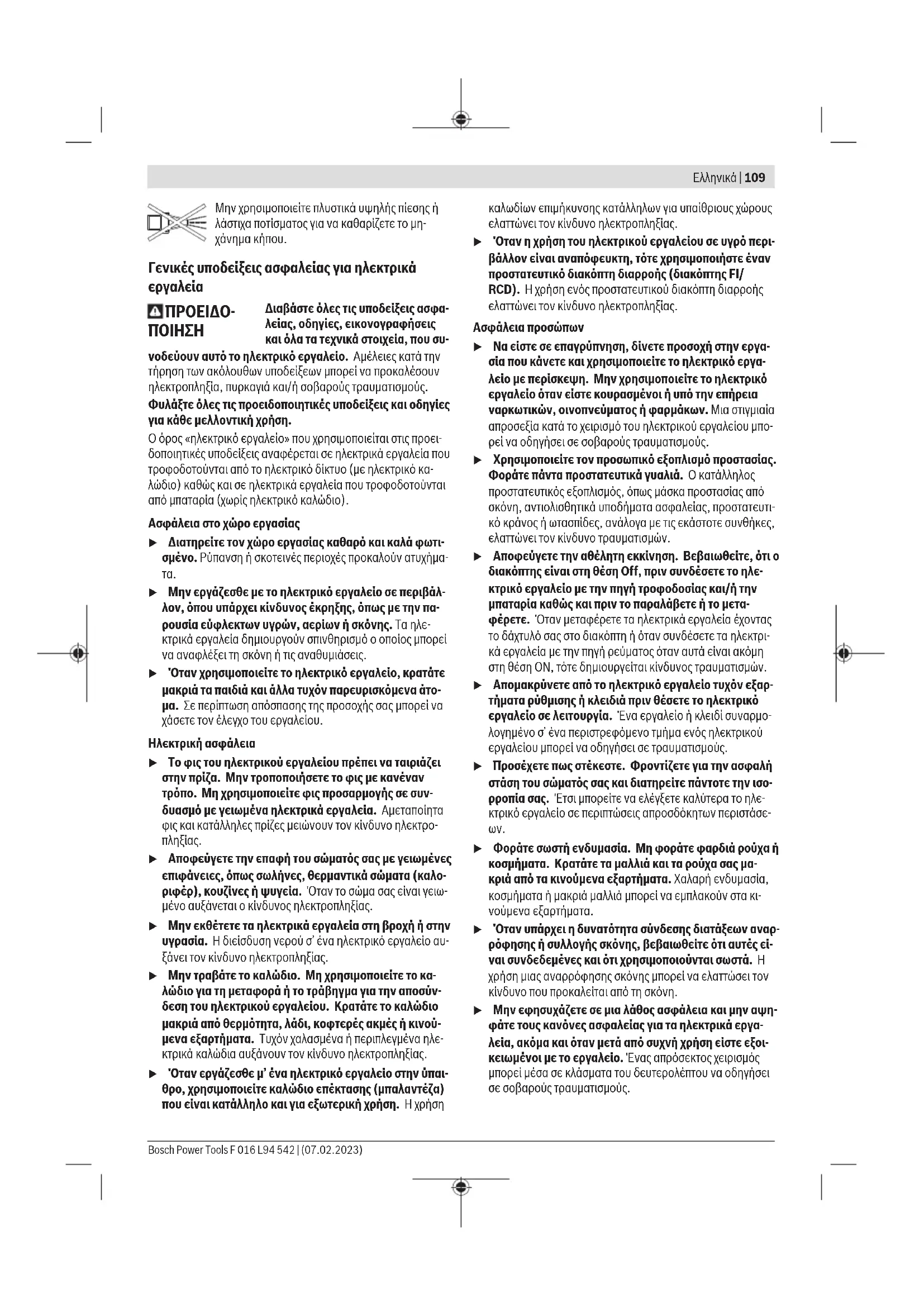 u Φοράτε σωστή ενδυμασία. Μη φοράτε φαρδιά ρούχα ή κοσμήματα. Κρατάτε τα μαλλιά και τα ρούχα σας μα- κριά από τα κινούμενα εξαρτήματα. Χαλαρή ενδυμασία, κοσμήματα ή μακριά μαλλιά μπορεί να εμπλακούν στα κι- νούμενα εξαρτήματα. u Όταν υπάρχει η δυνατότητα σύνδεσης διατάξεων αναρ- ρόφησης ή συλλογής σκόνης, βεβαιωθείτε ότι αυτές εί- ναι συνδεδεμένες και ότι χρησιμοποιούνται σωστά. Η χρήση μιας αναρρόφησης σκόνης μπορεί να ελαττώσει τον κίνδυνο που προκαλείται από τη σκόνη. u Μην εφησυχάζετε σε μια λάθος ασφάλεια και μην αψη- φάτε τους κανόνες ασφαλείας για τα ηλεκτρικά εργα- λεία, ακόμα και όταν μετά από συχνή χρήση είστε εξοι- κειωμένοι με το εργαλείο. Ένας απρόσεκτος χειρισμός μπορεί μέσα σε κλάσματα του δευτερολέπτου να οδηγήσει σε σοβαρούς τραυματισμούς. Bosch Power Tools F 016 L94 542 | (07.02.2023)110 | Ελληνικά Χρήση και φροντίδα των ηλεκτρικών εργαλείων u Μην υπερφορτώνετε το ηλεκτρικό εργαλείο. Χρησιμο- ποιήστε το σωστό ηλεκτρικό εργαλείο για την εφαρμο- γή σας. Με το κατάλληλο ηλεκτρικό εργαλείο εργάζεστε καλύτερα και ασφαλέστερα στην αναφερόμενη περιοχή