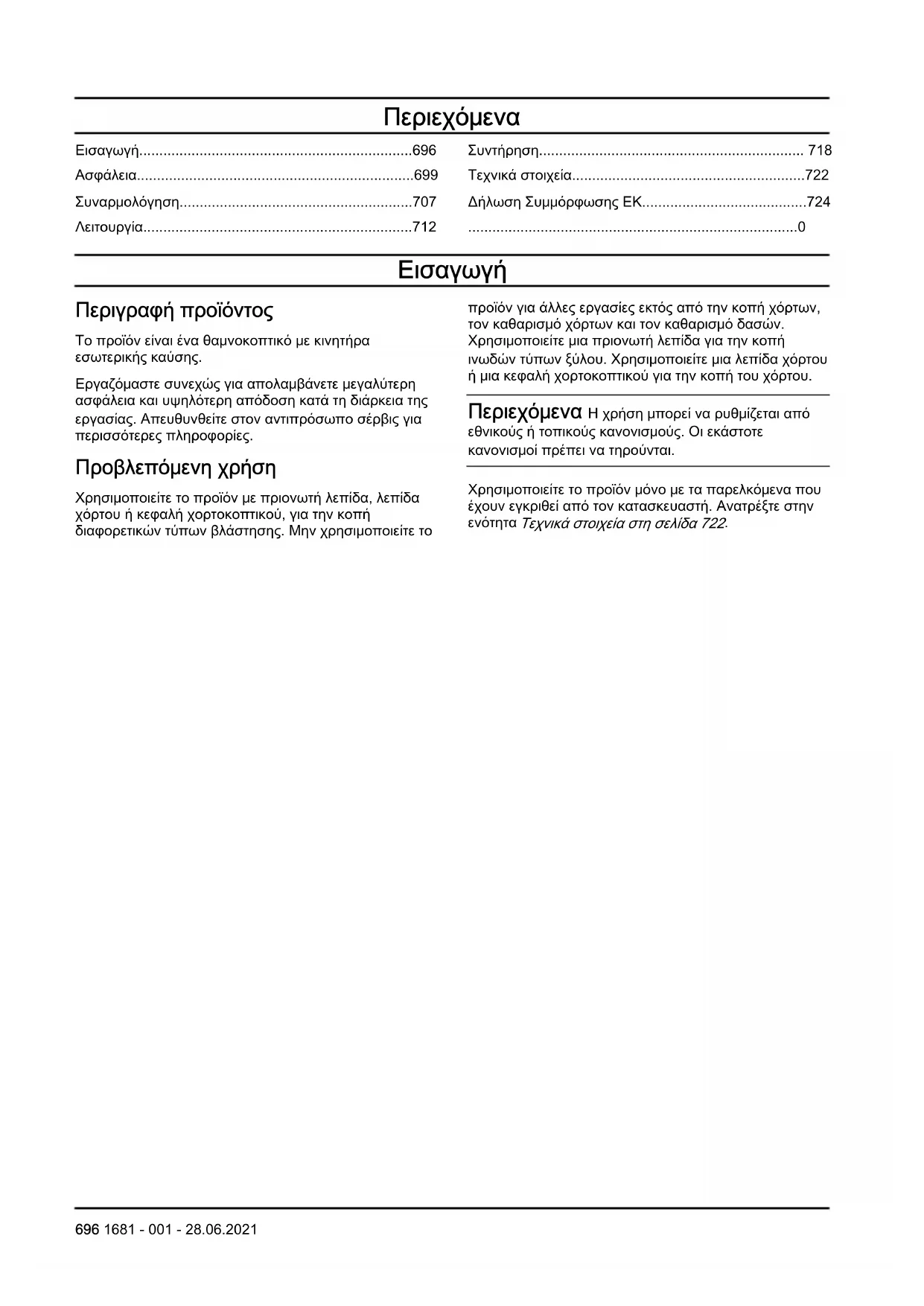 Περιγραφή προϊόντος Το προϊόν είναι ένα θαμνοκοπτικό με κινητήρα εσωτερικής καύσης. Εργαζόμαστε συνεχώς για απολαμβάνετε μεγαλύτερη ασφάλεια και υψηλότερη απόδοση κατά τη διάρκεια της εργασίας. Απευθυνθείτε στον αντιπρόσωπο σέρβις για περισσότερες πληροφορίες. Προβλεπόμενη χρήση Χρησιμοποιείτε το προϊόν με πριονωτή λεπίδα, λεπίδα χόρτου ή κεφαλή χορτοκοπτικού, για την κοπή διαφορετικών τύπων βλάστησης. Μην χρησιμοποιείτε το προϊόν για άλλες εργασίες εκτός από την κοπή χόρτων, τον καθαρισμό χόρτων και τον καθαρισμό δασών. Χρησιμοποιείτε μια πριονωτή λεπίδα για την κοπή ινωδών τύπων ξύλου. Χρησιμοποιείτε μια λεπίδα χόρτου ή μια κεφαλή χορτοκοπτικού για την κοπή του χόρτου. Περιεχόμενα Η χρήση μπορεί να ρυθμίζεται από εθνικούς ή τοπικούς κανονισμούς. Οι εκάστοτε κανονισμοί πρέπει να τηρούνται. Χρησιμοποιείτε το προϊόν μόνο με τα παρελκόμενα που έχουν εγκριθεί από τον κατασκευαστή. Ανατρέξτε στην