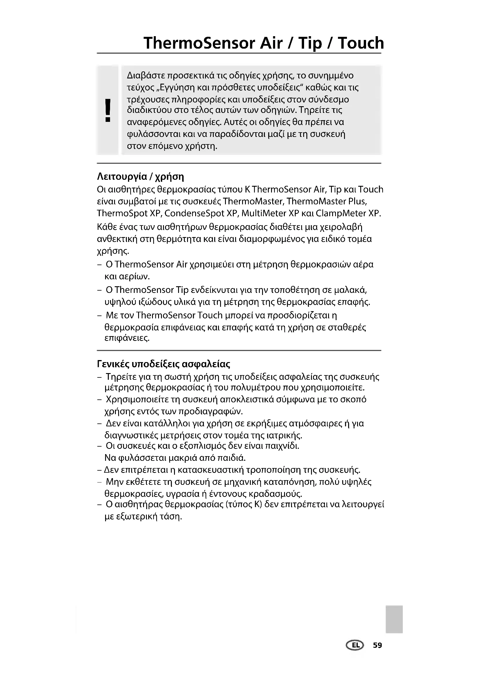 – Ο ThermoSensor Air χρησιμεύει στη μέτρηση θερμοκρασιών αέρα και αερίων. – Ο ThermoSensor Tip ενδείκνυται για την τοποθέτηση σε μαλακά, υψηλού ιξώδους υλικά για τη μέτρηση της θερμοκρασίας επαφής. – Με τον ThermoSensor Touch μπορεί να προσδιορίζεται η θερμοκρασία επιφάνειας και επαφής κατά τη χρήση σε σταθερές επιφάνειες. – Τηρείτε για τη σωστή χρήση τις υποδείξεις ασφαλείας της συσκευής μέτρησης θερμοκρασίας ή του πολυμέτρου που χρησιμοποιείτε. – Χρησιμοποιείτε τη συσκευή αποκλειστικά σύμφωνα με το σκοπό χρήσης εντός των προδιαγραφών. – Δεν είναι κατάλληλοι για χρήση σε εκρήξιµες ατµόσφαιρες ή για διαγνωστικές μετρήσεις στον τομέα της ιατρικής. – Οι συσκευές και ο εξοπλισμός δεν είναι παιχνίδι. Να φυλάσσεται μακριά από παιδιά. – Δεν επιτρέπεται η κατασκευαστική τροποποίηση της συσκευής. – Μην εκθέτετε τη συσκευή σε μηχανική καταπόνηση, πολύ υψηλές θερμοκρασίες, υγρασία ή έντονους κραδασμούς. – Ο αισθητήρας θερμοκρασίας (τύπος K) δεν επιτρέπεται να λειτουργεί με εξωτερική τάση. Γενικές υποδείξεις ασφαλείας Λειτουργία / χρήση Διαβάστε προσεκτικά τις οδηγίες χρήσης, το συνημμένο τεύχος „Εγγύηση και πρόσθετες υποδείξεις“ καθώς και τις τρέχουσες πληροφορίες και υποδείξεις στον σύνδεσμο διαδικτύου στο τέλος αυτών των οδηγιών. Τηρείτε τις αναφερόμενες οδηγίες. Αυτές οι οδηγίες θα πρέπει να φυλάσσονται και να παραδίδονται μαζί με τη συσκευή στον επόμενο χρήστη.