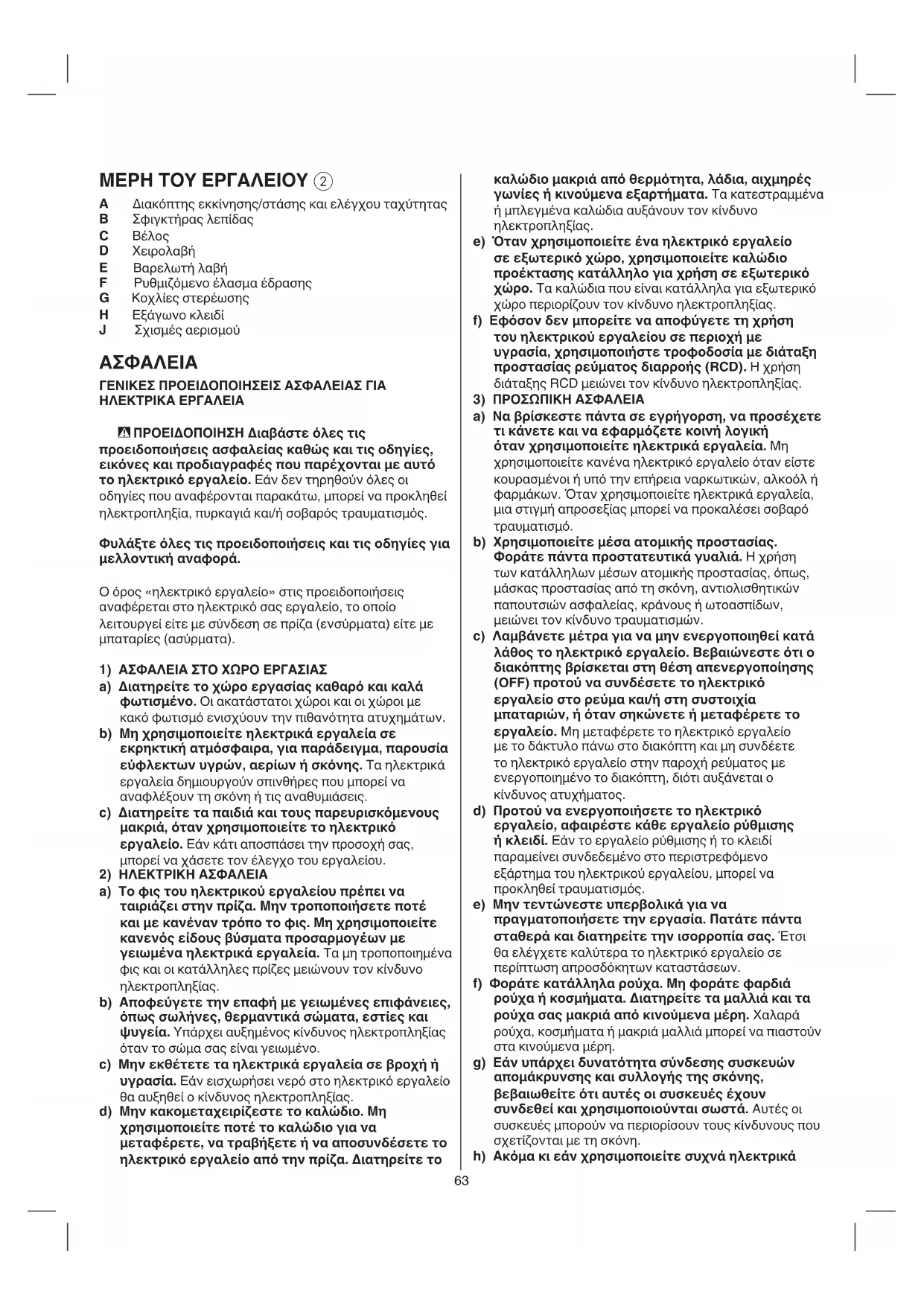 a) Ναβρίσκεστεπάντασεεγρήγορση,ναπροσέχετε τικάνετεκαιναεφαρμόζετεκοινήλογική ότανχρησιμοποιείτεηλεκτρικάεργαλεία. Μη χρησιμοποιείτε κανένα ηλεκτρικό εργαλείο όταν είστε κουρασμένοι ή υπό την επήρεια ναρκωτικών, αλκοόλ ή φαρμάκων. Όταν χρησιμοποιείτε ηλεκτρικά εργαλεία, μια στιγμή απροσεξίας μπορεί να προκαλέσει σοβαρό τραυματισμό. b) Χρησιμοποιείτεμέσαατομικήςπροστασίας. Φοράτεπάνταπροστατευτικάγυαλιά. Η χρήση των κατάλληλων μέσων ατομικής προστασίας, όπως, μάσκας προστασίας από τη σκόνη, αντιολισθητικών παπουτσιών ασφαλείας, κράνους ή ωτοασπίδων, μειώνει τον κίνδυνο τραυματισμών. c) Λαμβάνετεμέτραγιαναμηνενεργοποιηθείκατά λάθοςτοηλεκτρικόεργαλείο.Βεβαιώνεστεότιο διακόπτηςβρίσκεταιστηθέσηαπενεργοποίησης (OFF)προτούνασυνδέσετετοηλεκτρικό εργαλείοστορεύμακαι/ήστησυστοιχία μπαταριών,ήότανσηκώνετεήμεταφέρετετο εργαλείο.Μη μεταφέρετε το ηλεκτρικό εργαλείο με το δάκτυλο πάνω στο διακόπτη και μη συνδέετε το ηλεκτρικό εργαλείο στην παροχή ρεύματος με ενεργοποιημένο το διακόπτη, διότι αυξάνεται ο κίνδυνος ατυχήματος. d) Προτούναενεργοποιήσετετοηλεκτρικό εργαλείο,αφαιρέστεκάθεεργαλείορύθμισης ήκλειδί.Εάν το εργαλείο ρύθμισης ή το κλειδί παραμείνει συνδεδεμένο στο περιστρεφόμενο εξάρτημα του ηλεκτρικού εργαλείου, μπορεί να προκληθεί τραυματισμός. e) Μηντεντώνεστευπερβολικάγιανα πραγματοποιήσετετηνεργασία.Πατάτεπάντα σταθεράκαιδιατηρείτετηνισορροπίασας. Έτσι θα ελέγχετε καλύτερα το ηλεκτρικό εργαλείο σε περίπτωση απροσδόκητων καταστάσεων. f) Φοράτεκατάλληλαρούχα.Μηφοράτεφαρδιά ρούχαήκοσμήματα.Διατηρείτεταμαλλιάκαιτα ρούχασαςμακριάαπόκινούμεναμέρη.Χαλαρά ρούχα, κοσμήματα ή μακριά μαλλιά μπορεί να πιαστούν στα κινούμενα μέρη. g) Εάνυπάρχειδυνατότητασύνδεσηςσυσκευών απομάκρυνσηςκαισυλλογήςτηςσκόνης, βεβαιωθείτεότιαυτέςοισυσκευέςέχουν συνδεθείκαιχρησιμοποιούνταισωστά.Αυτές οι συσκευές μπορούν να περιορίσουν τους κίνδυνους που σχετίζονται με τη σκόνη. h) Ακόμακιεάνχρησιμοποιείτεσυχνάηλεκτρικά ΜΕΡΗΤΟYΕΡΓΑΛΕΙΟY2 A Διακόπτης εκκίνησης/στάσης και ελέγχου ταχύτητας B Σφιγκτήρας λεπίδας C Βέλος D Χειρολαβή E Βαρελωτή λαβή F Ρυθµιζόµενο έλασµα έδρασης G Κοχλίες στερέωσης H Εξάγωνο κλειδί J Σχισμές αερισμού
