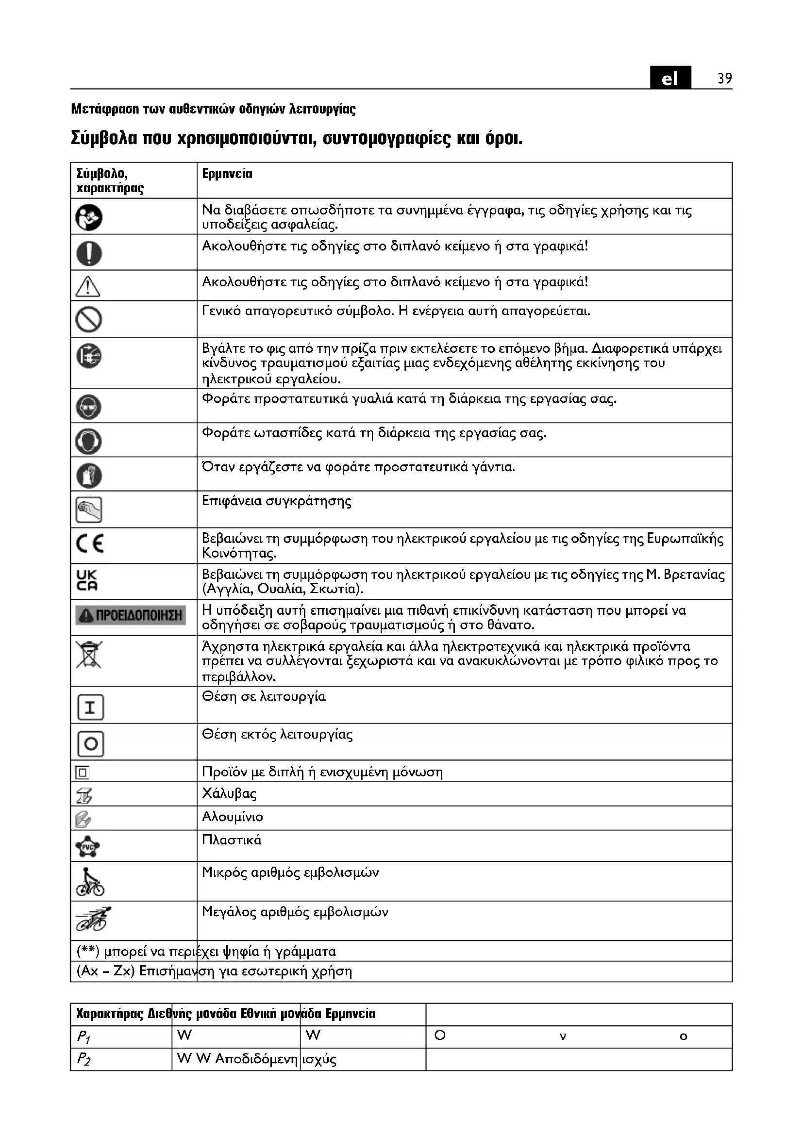 Να διαβάσετε οπωσδήποτε τα συνημμένα έγγραφα, τις οδηγίες χρήσης και τις υποδείξεις ασφαλείας. Ακολουθήστε τις οδηγίες στο διπλανό κείμενο ή στα γραφικά! Ακολουθήστε τις οδηγίες στο διπλανό κείμενο ή στα γραφικά! Γενικό απαγορευτικό σύμβολο. Η ενέργεια αυτή απαγορεύεται. Βγάλτε το φις από την πρίζα πριν εκτελέσετε το επόμενο βήμα. Διαφορετικά υπάρχει κίνδυνος τραυματισμού εξαιτίας μιας ενδεχόμενης αθέλητης εκκίνησης του ηλεκτρικού εργαλείου. Φοράτε προστατευτικά γυαλιά κατά τη διάρκεια της εργασίας σας. Φοράτε ωτασπίδες κατά τη διάρκεια της εργασίας σας. Όταν εργάζεστε να φοράτε προστατευτικά γάντια. Επιφάνεια συγκράτησης Βεβαιώνει τη συμμόρφωση του ηλεκτρικού εργαλείου με τις οδηγίες της Ευρωπαϊκής Κοινότητας. Βεβαιώνει τη συμμόρφωση του ηλεκτρικού εργαλείου με τις οδηγίες της Μ. Βρετανίας (Αγγλία, Ουαλία, Σκωτία). Η υπόδειξη αυτή επισημαίνει μια πιθανή επικίνδυνη κατάσταση που μπορεί να οδηγήσει σε σοβαρούς τραυματισμούς ή στο θάνατο. Άχρηστα ηλεκτρικά εργαλεία και άλλα ηλεκτροτεχνικά και ηλεκτρικά προϊόντα πρέπει να συλλέγονται ξεχωριστά και να ανακυκλώνονται με τρόπο φιλικό προς το περιβάλλον. Θέση σε λειτουργία Θέση εκτός λειτουργίας Προϊόν με διπλή ή ενισχυμένη μόνωση