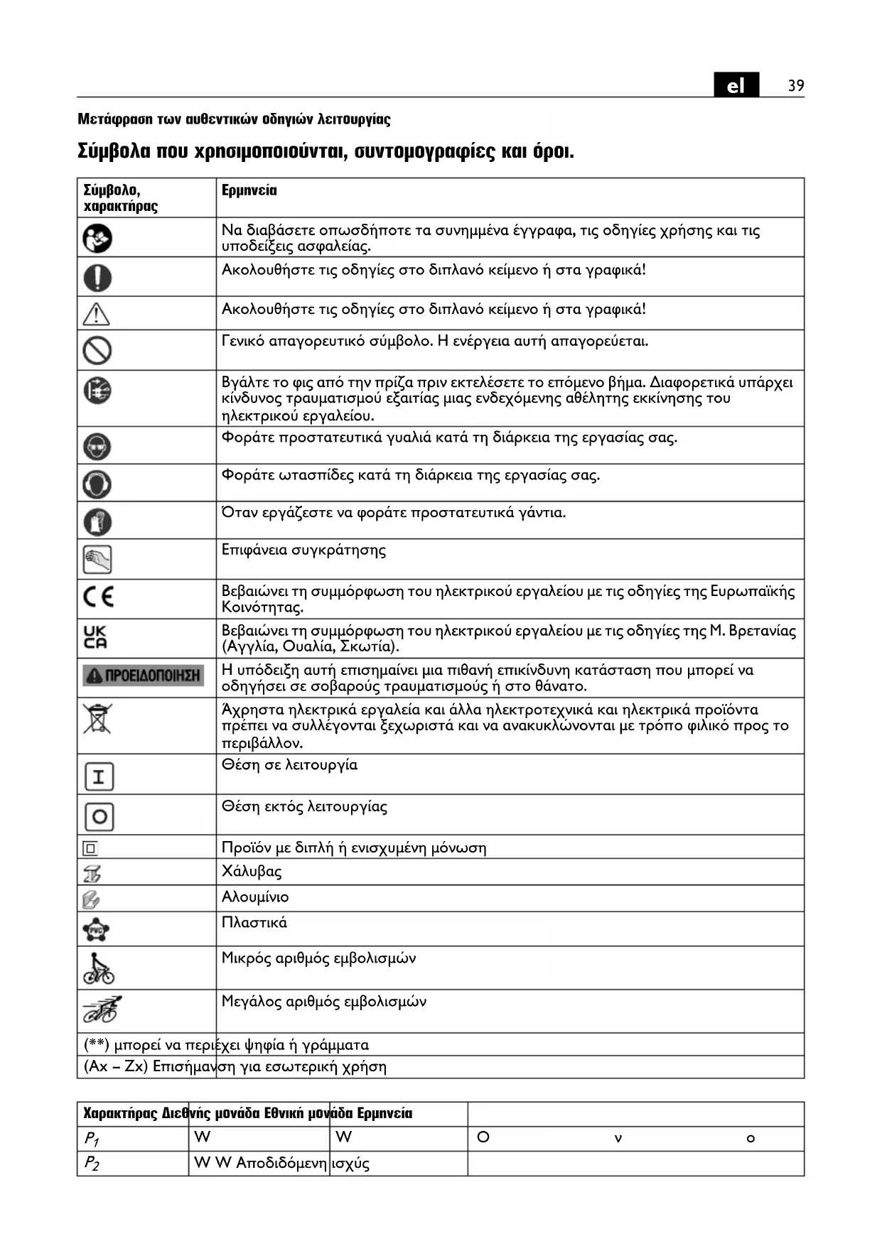 Να διαβάσετε οπωσδήποτε τα συνημμένα έγγραφα, τις οδηγίες χρήσης και τις υποδείξεις ασφαλείας. Ακολουθήστε τις οδηγίες στο διπλανό κείμενο ή στα γραφικά! Ακολουθήστε τις οδηγίες στο διπλανό κείμενο ή στα γραφικά! Γενικό απαγορευτικό σύμβολο. Η ενέργεια αυτή απαγορεύεται. Βγάλτε το φις από την πρίζα πριν εκτελέσετε το επόμενο βήμα. Διαφορετικά υπάρχει κίνδυνος τραυματισμού εξαιτίας μιας ενδεχόμενης αθέλητης εκκίνησης του ηλεκτρικού εργαλείου. Φοράτε προστατευτικά γυαλιά κατά τη διάρκεια της εργασίας σας. Φοράτε ωτασπίδες κατά τη διάρκεια της εργασίας σας. Όταν εργάζεστε να φοράτε προστατευτικά γάντια. Επιφάνεια συγκράτησης Βεβαιώνει τη συμμόρφωση του ηλεκτρικού εργαλείου με τις οδηγίες της Ευρωπαϊκής Κοινότητας. Βεβαιώνει τη συμμόρφωση του ηλεκτρικού εργαλείου με τις οδηγίες της Μ. Βρετανίας (Αγγλία, Ουαλία, Σκωτία). Η υπόδειξη αυτή επισημαίνει μια πιθανή επικίνδυνη κατάσταση που μπορεί να οδηγήσει σε σοβαρούς τραυματισμούς ή στο θάνατο. Άχρηστα ηλεκτρικά εργαλεία και άλλα ηλεκτροτεχνικά και ηλεκτρικά προϊόντα πρέπει να συλλέγονται ξεχωριστά και να ανακυκλώνονται με τρόπο φιλικό προς το περιβάλλον. Θέση σε λειτουργία Θέση εκτός λειτουργίας Προϊόν με διπλή ή ενισχυμένη μόνωση