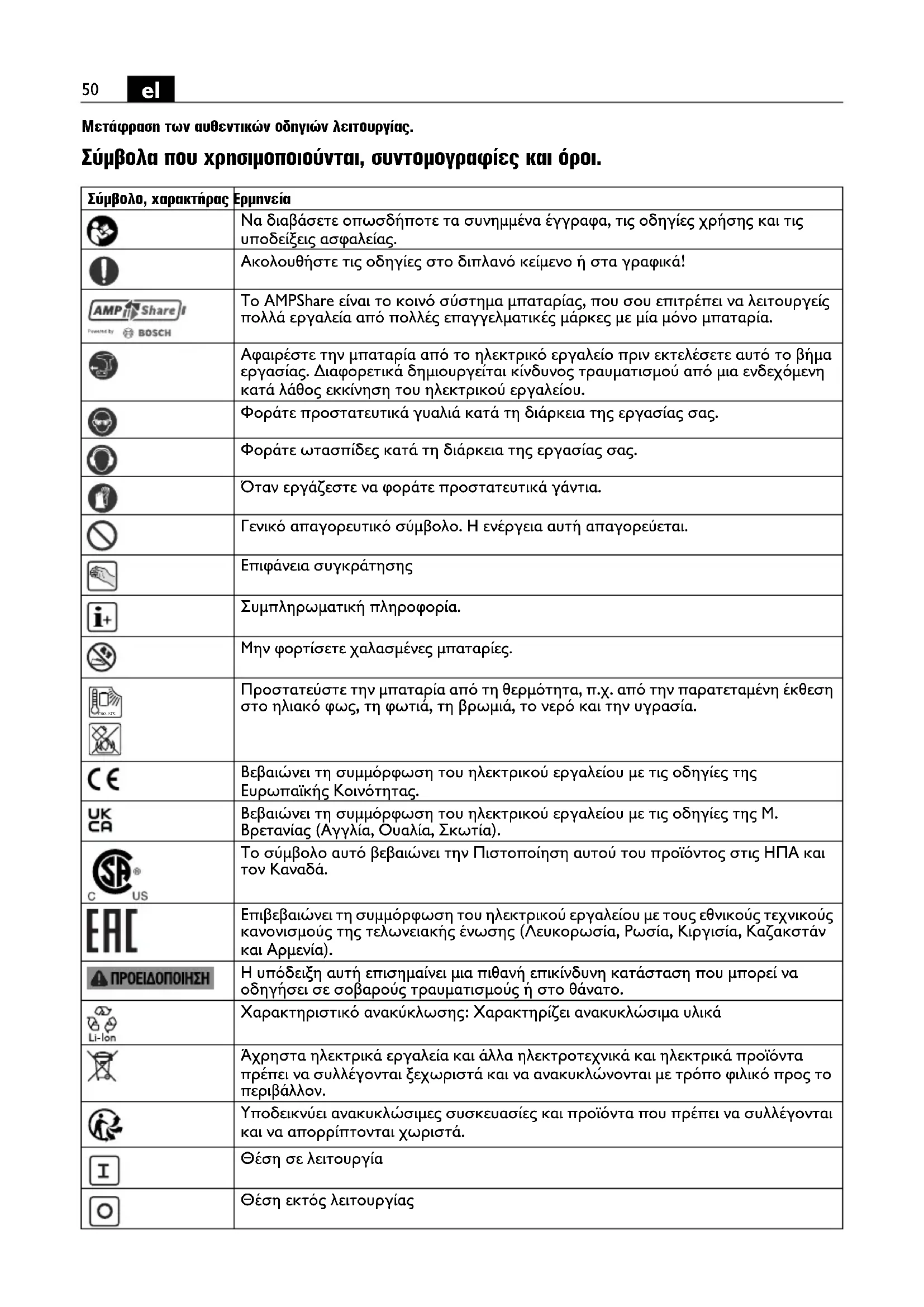Μετάφραση των αυθεντικών οδηγιών λειτουργίας. Σύμβολα που χρησιμοποιούνται, συντομογραφίες και όροι. Σύμβολο, χαρακτήρας Ερμηνεία Να διαβάσετε οπωσδήποτε τα συνημμένα έγγραφα, τις οδηγίες χρήσης και τις υποδείξεις ασφαλείας. Ακολουθήστε τις οδηγίες στο διπλανό κείμενο ή στα γραφικά! Το AMPShare είναι το κοινό σύστημα μπαταρίας, που σου επιτρέπει να λειτουργείς πολλά εργαλεία από πολλές επαγγελματικές μάρκες με μία μόνο μπαταρία. Αφαιρέστε την μπαταρία από το ηλεκτρικό εργαλείο πριν εκτελέσετε αυτό το βήμα εργασίας. Διαφορετικά δημιουργείται κίνδυνος τραυματισμού από μια ενδεχόμενη κατά λάθος εκκίνηση του ηλεκτρικού εργαλείου. Φοράτε προστατευτικά γυαλιά κατά τη διάρκεια της εργασίας σας. Φοράτε ωτασπίδες κατά τη διάρκεια της εργασίας σας. Όταν εργάζεστε να φοράτε προστατευτικά γάντια. Γενικό απαγορευτικό σύμβολο. Η ενέργεια αυτή απαγορεύεται. Επιφάνεια συγκράτησης Συμπληρωματική πληροφορία. Μην φορτίσετε χαλασμένες μπαταρίες. Προστατεύστε την μπαταρία από τη θερμότητα, π.χ. από την παρατεταμένη έκθεση στο ηλιακό φως, τη φωτιά, τη βρωμιά, το νερό και την υγρασία. Βεβαιώνει τη συμμόρφωση του ηλεκτρικού εργαλείου με τις οδηγίες της Ευρωπαϊκής Κοινότητας. Βεβαιώνει τη συμμόρφωση του ηλεκτρικού εργαλείου με τις οδηγίες της Μ. Βρετανίας (Αγγλία, Ουαλία, Σκωτία). Το σύμβολο αυτό βεβαιώνει την Πιστοποίηση αυτού του προϊόντος στις ΗΠΑ και τον Καναδά. Επιβεβαιώνει τη συμμόρφωση του ηλεκτρικού εργαλείου με τους εθνικούς τεχνικούς κανονισμούς της τελωνειακής ένωσης (Λευκορωσία, Ρωσία, Κιργισία, Καζακστάν και Αρμενία). Η υπόδειξη αυτή επισημαίνει μια πιθανή επικίνδυνη κατάσταση που μπορεί να οδηγήσει σε σοβαρούς τραυματισμούς ή στο θάνατο. Χαρακτηριστικό ανακύκλωσης: Χαρακτηρίζει ανακυκλώσιμα υλικά Άχρηστα ηλεκτρικά εργαλεία και άλλα ηλεκτροτεχνικά και ηλεκτρικά προϊόντα πρέπει να συλλέγονται ξεχωριστά και να ανακυκλώνονται με τρόπο φιλικό προς το περιβάλλον. Υποδεικνύει ανακυκλώσιμες συσκευασίες και προϊόντα που πρέπει να συλλέγονται και να απορρίπτονται χωριστά. Θέση σε λειτουργία Θέση εκτός λειτουργίας max.50°C51