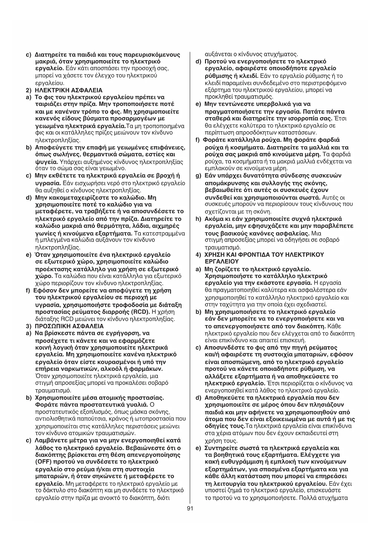 a) Να βρίσκεστε πάντα σε εγρήγορση, να προσέχετε τι κάνετε και να εφαρμόζετε κοινή λογική όταν χρησιμοποιείτε ηλεκτρικά εργαλεία. Μη χρησιμοποιείτε κανένα ηλεκτρικό εργαλείο όταν είστε κουρασμένοι ή υπό την επήρεια ναρκωτικών, αλκοόλ ή φαρμάκων. Όταν χρησιμοποιείτε ηλεκτρικά εργαλεία, μια στιγμή απροσεξίας μπορεί να προκαλέσει σοβαρό τραυματισμό. b) Χρησιμοποιείτε μέσα ατομικής προστασίας. Φοράτε πάντα προστατευτικά γυαλιά. Ο προστατευτικός εξοπλισμός, όπως μάσκα σκόνης, αντιολισθητικά παπούτσια, κράνος ή ωτοπροστασία που χρησιμοποιείται στις κατάλληλες περιστάσεις μειώνει τον κίνδυνο ατομικών τραυματισμών. c) Λαμβάνετε μέτρα για να μην ενεργοποιηθεί κατά λάθος το ηλεκτρικό εργαλείο. Βεβαιώνεστε ότι ο διακόπτης βρίσκεται στη θέση απενεργοποίησης (OFF) προτού να συνδέσετε το ηλεκτρικό εργαλείο στο ρεύμα ή/και στη συστοιχία μπαταριών, ή όταν σηκώνετε ή μεταφέρετε το εργαλείο. Μη μεταφέρετε το ηλεκτρικό εργαλείο με το δάκτυλο στο διακόπτη και μη συνδέετε το ηλεκτρικό εργαλείο στην πρίζα με ανοικτό το διακόπτη, διότι92 ή το ηλεκτρικό εργαλείο εκτός του εύρους θερμοκρασίας που αναφέρεται στις οδηγίες. Εάν η φόρτιση δε γίνει σωστά ή πραγματοποιηθεί σε θερμοκρασία εκτός του καθορισμένου εύρους, η συστοιχία μπαταριών μπορεί να υποστεί ζημιά και να αυξηθεί ο κίνδυνος πυρκαγιάς.