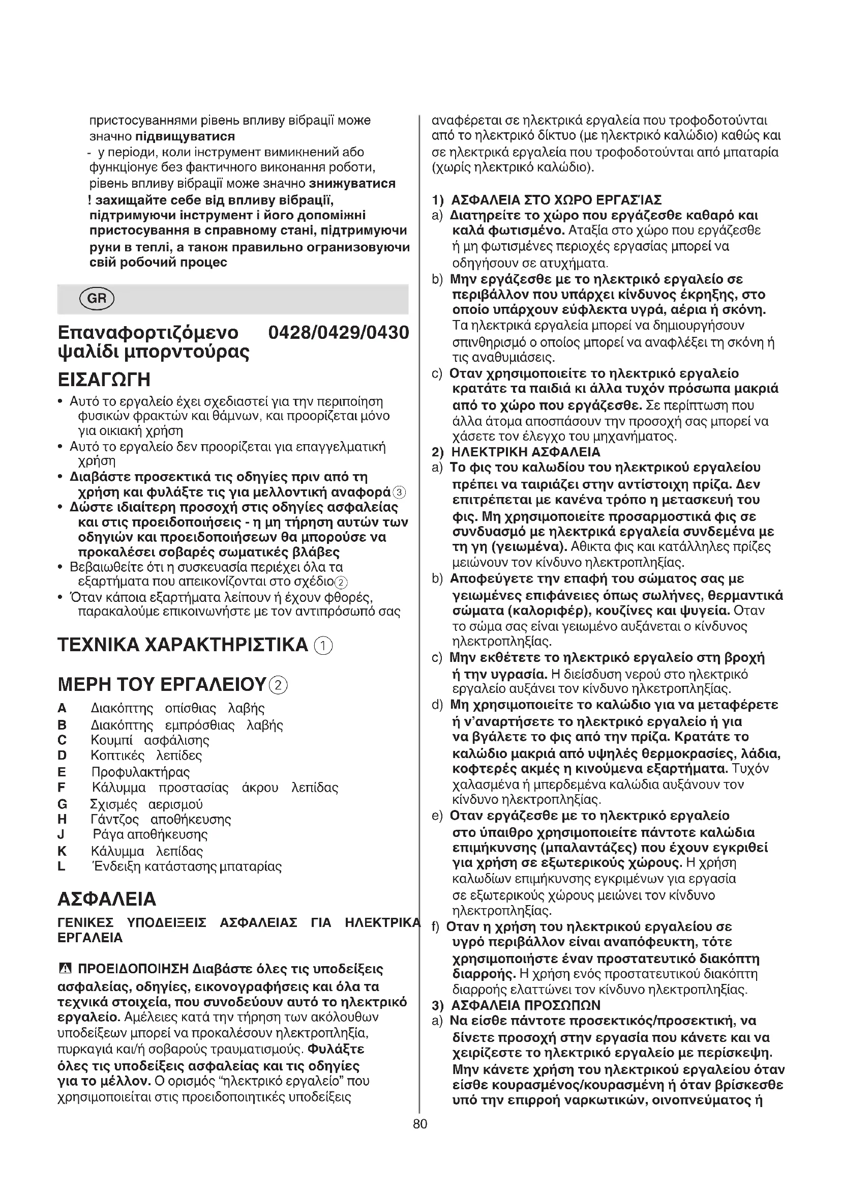 - ΠΡΟEΙΔΟΠΟΙΗΣΗ Διαβάστε όλες τις υποδείξεις ασφαλείας, οδηγίες, εικονογραφήσεις και όλα τα τεχνικά στοιχεία, που συνοδεύουν αυτό το ηλεκτρικό εργαλείο. Αμέλειες κατά την τήρηση των ακόλουθων υποδείξεων μπορεί να προκαλέσουν ηλεκτροπληξία, πυρκαγιά και/ή σοβαρούς τραυματισμούς. Φυλάξτε όλες τις υποδείξεις ασφαλείας και τις οδηγίες για το μέλλον. Ο ορισμός “ηλεκτρικό εργαλείο” που χρησιμοποιείται στις προειδοποιητικές υποδείξεις81 εκτελέσετε ρυθμίσεις στο ηλεκτρικό εργαλείο, προτού αλλάξετε εξαρτήματα ή φυλάξετε το ηλεκτρικό εργαλείο. Αυτά τα προληπτικά μέτρα ασφαλείας μειώνουν τον κίνδυνο από τυχόν αθέλητη εκκίνηση του ηλεκτρικού εργαλείου. d) Διαφυλάγετε τα ηλεκτρικά εργαλεία που δε χρησιμοποιείτε μακριά από παιδιά. Μην αφήνετε άτομα που δεν είναι εξοικειωμένα με το ηλεκτρικό εργαλείο ή δεν έχουν διαβάσει αυτές τις οδηγίες χρήσης να το χρησιμοποιήσουν. Τα ηλεκτρικά εργαλεία είναι επικίνδυνα όταν χρησιμοποιούνται από άπειρα πρόσωπα. e) Φροντίζετε τα ηλεκτρικά εργαλεία και τα εξάρτημα με επιμέλεια. Ελέγχετε, αν τα κινούμενα εξαρτήματα λειτουργούν άψογα, χωρίς να μπλοκάρουν, ή μήπως έχουν σπάσει ή φθαρεί τυχόν εξαρτήματα τα οποία επηρεάζουν τον τρόπο λειτουργίας του ηλεκτρικού εργαλείου. Δώστε αυτά τα χαλασμένα εξαρτήματα για επισκευή πριν τα ξαναχρησιμοποιήσετε. Η κακή συντήρηση των ηλεκτρικών εργαλείων αποτελεί αιτία πολλών ατυχημάτων. f) Διατηρείτε τα κοπτικά εργαλεία κοφτερά και καθαρά. Τα κοπτικά εργαλεία που συντηρούνται με προσοχή μπορούν να οδηγηθούν εύκολα και να ελεγχθούν καλύτερα. g) Xρησιμοποιείτε τα ηλεκτρικά εργαλεία, τα εξαρτήματα, τα χρησιμοποιήσιμα εργαλεία κτλ. σύμφωνα με τις παρούσες οδηγίες καθώς. Λαμβάνετε ταυτόχρονα υπόψην σας τις συνθήκες εργασίας και την υπό εκτέλεση εργασία. Η χρήση του ηλεκτρικού εργαλείου για άλλες εκτός από τις προβλεπόμενες εργασίες μπορεί να δημιουργήσει επικίνδυνες καταστάσεις. h) Διατηρείτε τις λαβές και επιφάνειες λαβής στεγνές, καθαρές και ελεύθερες από λάδι και γράσο. Οι ολισθηρές λαβές και επιφάνειες λαβής δεν επιτρέπουν κανέναν ασφαλή χειρισμό και έλεγχο του ηλεκτρικού εργαλείου σε τυχόν απρόβλεπτες καταστάσεις.