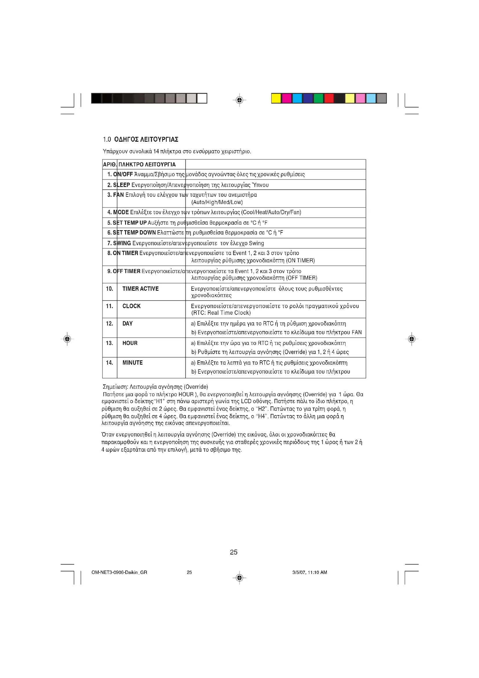 Υπάρχουν συνολικά 14 πλήκτρα στο ενσύρµατο χειριστήριο. Σηµείωση: Λειτουργία αγνησης (Override) Πατήστε µια φορά το πλήκτρο HOUR ), θα ενεργοποιηθεί η λειτουργία αγνησης (Override) για 1 ώρα. Θα εµφανιστεί ο δείκτης“H1” στη πάνω αριστερή γωνία της LCD οθνης. Πατήστε πάλι το ίδιο πλήκτρο, η ρύθµιση θα αυξηθεί σε 2 ώρες. Θα εµφανιστεί ένας δείκτης, ο “H2”. Πατώντας το για τρίτη φορά, η ρύθµιση θα αυξηθεί σε 4 ώρες. Θα εµφανιστεί ένας δείκτης, ο “H4”. Πατώντας το άλλη µια φορά η λειτουργία αγνησης της εικνας απενεργοποιείται. +ταν ενεργοποιηθεί η λειτουργία αγνησης (Override) της εικνας, λοι οι χρονοδιακπτες θα παρακαµφθούν και η ενεργοποίηση της συσκευής για σταθερές χρονικές περιδους της 1 ώρας ή των 2 ή 4 ωρών εξαρτάται απ την επιλογή, µετά το σβήσιµο της. OM-NET3-0906-Daikin_GR 3/5/07, 11:10 AM2526