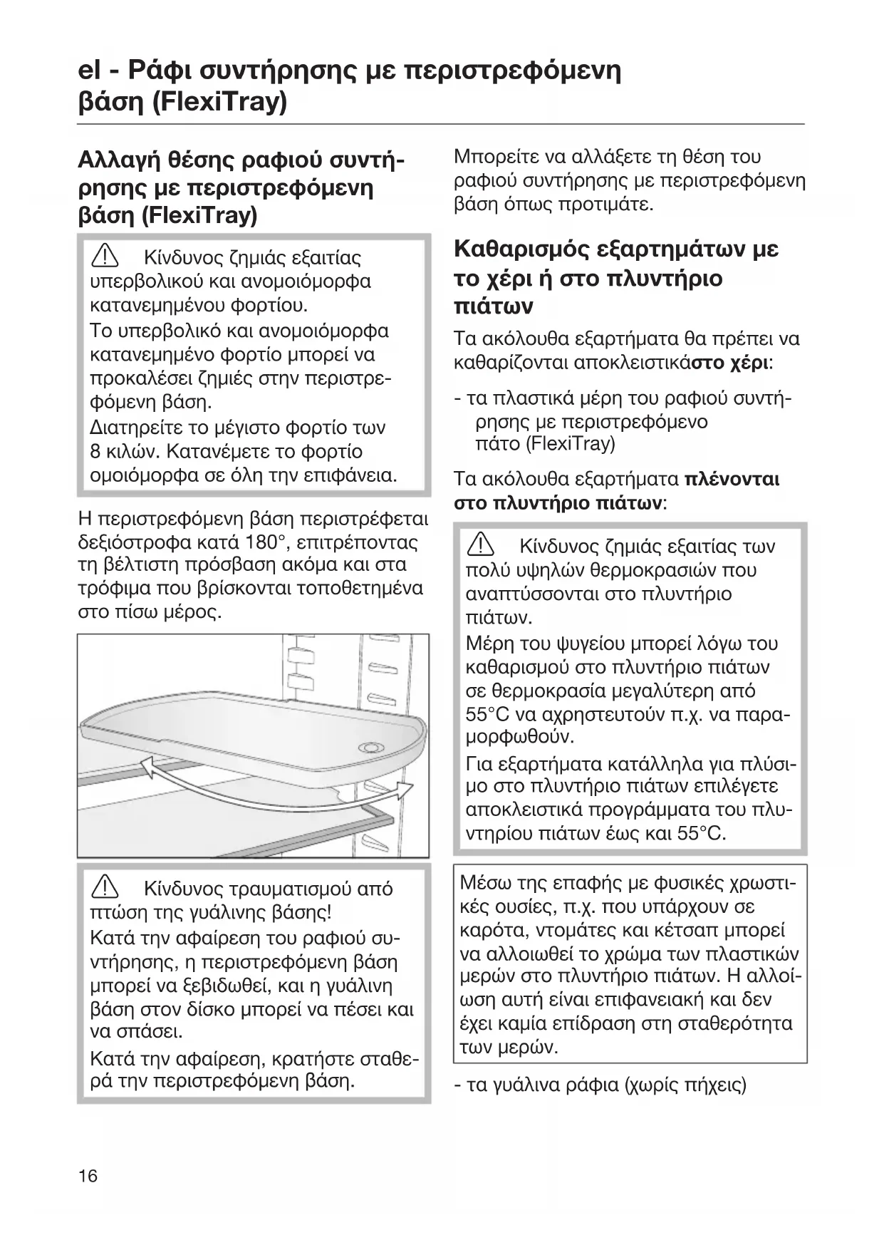 Τα ακόλουθα εξαρτήματα θα πρέπει να καθαρίζονται αποκλειστικάστο χέρι: - τα πλαστικά μέρη του ραφιού συντή- ρησης με περιστρεφόμενο πάτο(FlexiTray) Τα ακόλουθα εξαρτήματα πλένονται στο πλυντήριο πιάτων: Κίνδυνος ζημιάς εξαιτίας των πολύ υψηλών θερμοκρασιών που αναπτύσσονται στο πλυντήριο