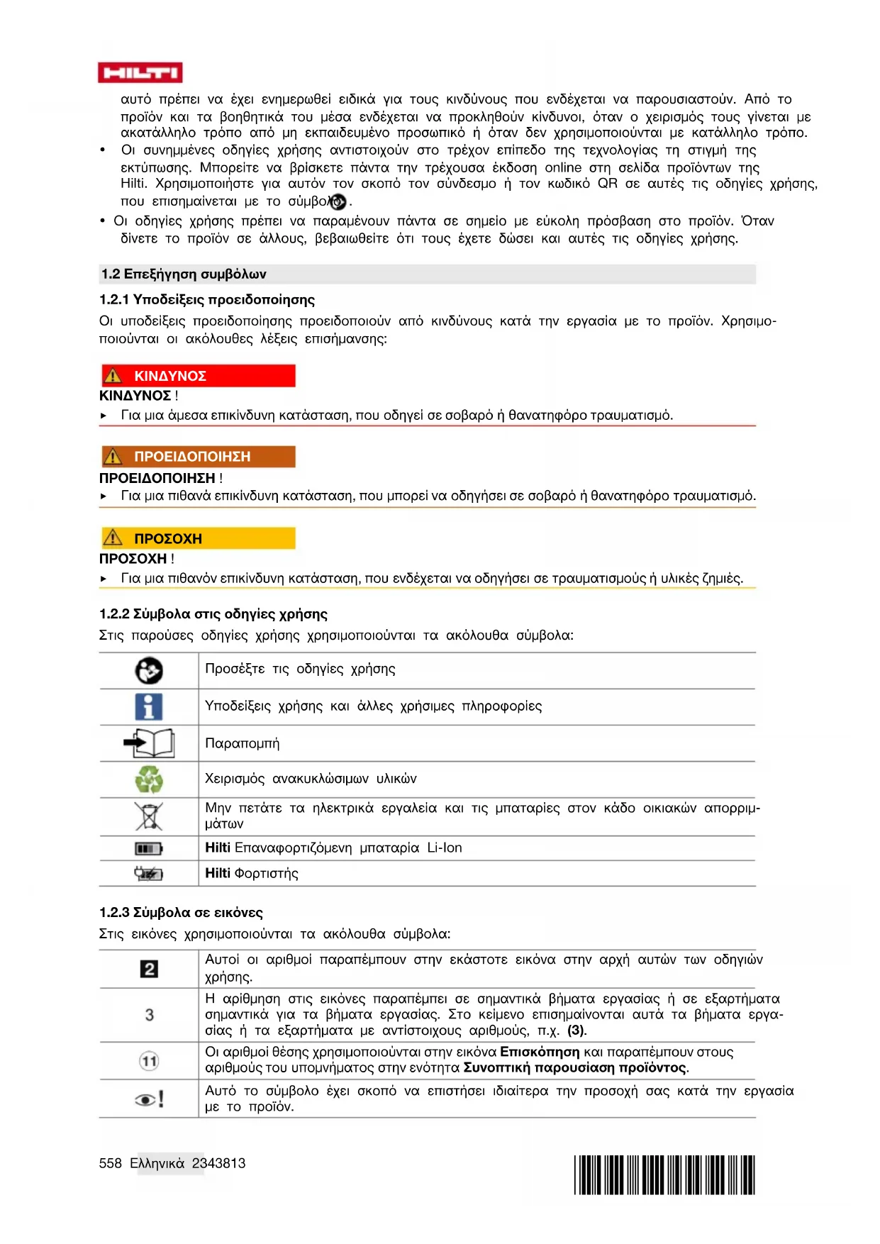 Τα προϊόντα της Hilti είναι κατασκευασμένα σε μεγάλο ποσοστό από ανακυκλώσιμα υλικά. Προϋπόθεση για τηνανακύκλωσήτους είναι ο κατάλληλος διαχωρισμόςτων υλικών. Σε πολλές χώρες, η Hilti παραλαμβάνει το παλιό σας εργαλείο για ανακύκλωση. Απευθυνθείτε στο σέρβις της Hilti ή στον σύμβουλο πωλήσεων. ▶ Μην πετάτε τα ηλεκτρικά εργαλεία, της ηλεκτρονικές συσκευές και τις επαναφορτιζόμενες μπαταρίες στον κάδο οικιακών απορριμμάτων! 11 Εγγύηση κατασκευαστή ▶ Για ερωτήσεις σχετικά με τους όρους εγγύησης απευθυνθείτε στον τοπικό συνεργάτη της Hilti. 12 Περισσότερες πληροφορίες Αξεσουάρ, προϊόντα συστήματος και περισσότερες πληροφορίες για το προϊόν σας θα βρείτε εδώ.578 Ελληνικά 2343813 *2343813* RoHS (οδηγία για τον περιορισμό της χρήσης επικίνδυνων ουσιών) Αυτός ο πίνακας ισχύει για την αγορά της Κίνας. Συνθήκες: Νότια Κορέα Πληροφορίες έγκρισης που ισχύουν σε κάθε χώρα
