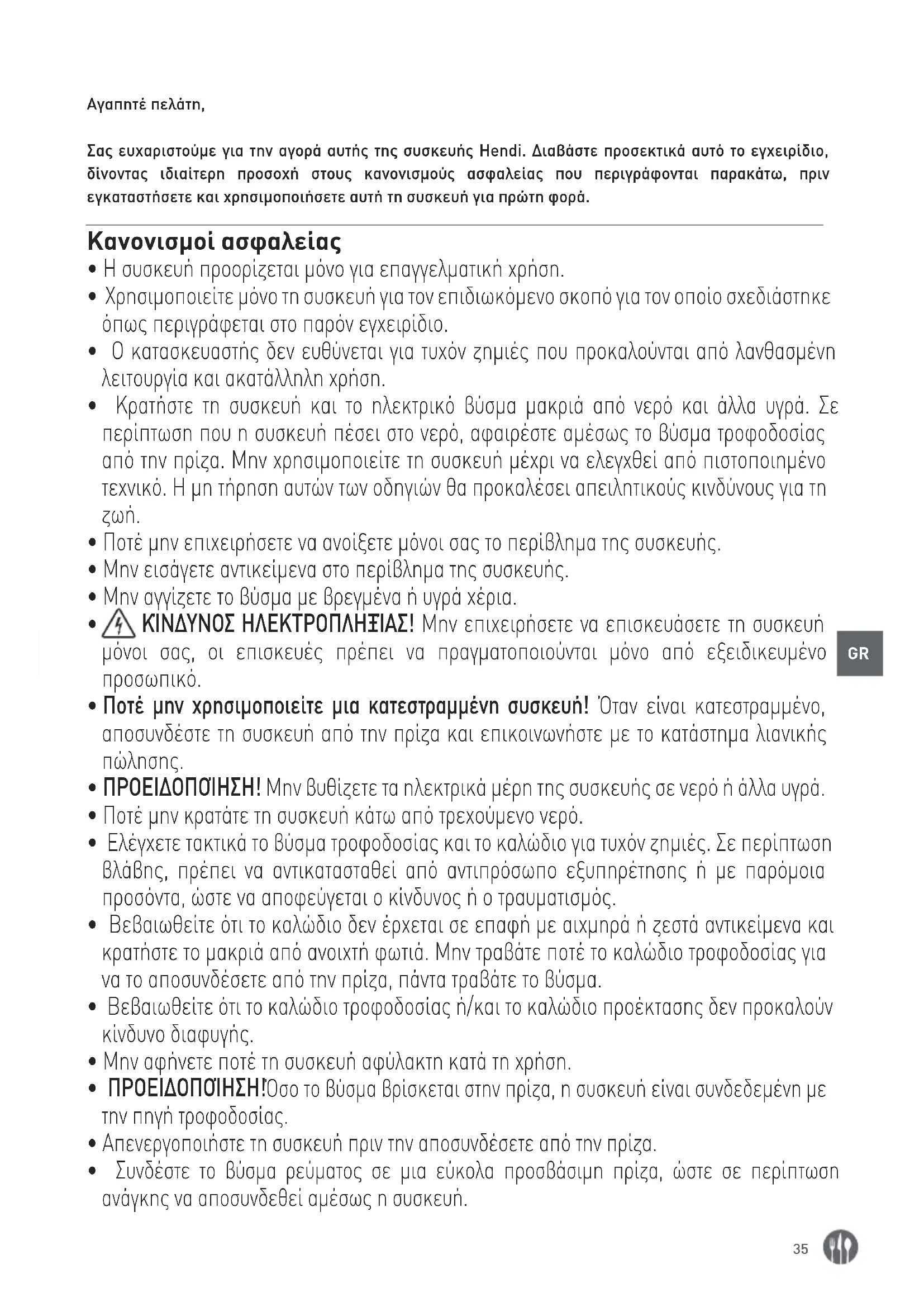 Αγαπητέ πελάτη, Σας ευχαριστούμε για την αγορά αυτής της συσκευής Hendi. Διαβάστε προσεκτικά αυτό το εγχειρίδιο, δίνοντας ιδιαίτερη προσοχή στους κανονισμούς ασφαλείας που περιγράφονται παρακάτω, πριν εγκαταστήσετε και χρησιμοποιήσετε αυτή τη συσκευή για πρώτη φορά. Κανονισμοί ασφαλείας