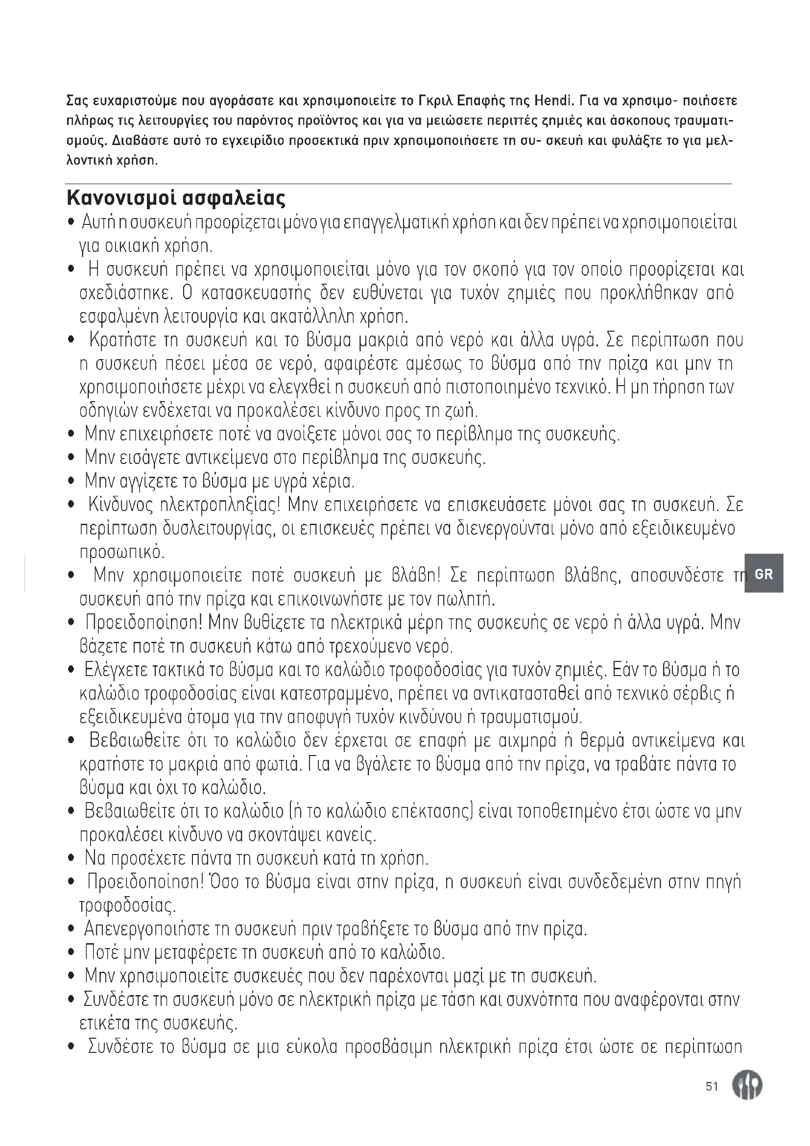 Σας ευχαριστούμε που αγοράσατε και χρησιμοποιείτε το Γκριλ Επαφής της Hendi. Για να χρησιμο- ποιήσετε πλήρως τις λειτουργίες του παρόντος προϊόντος και για να μειώσετε περιττές ζημιές και άσκοπους τραυματι- σμούς. Διαβάστε αυτό το εγχειρίδιο προσεκτικά πριν χρησιμοποιήσετε τη συ- σκευή και φυλάξτε το για μελ- λοντική χρήση. Κανονισμοί ασφαλείας