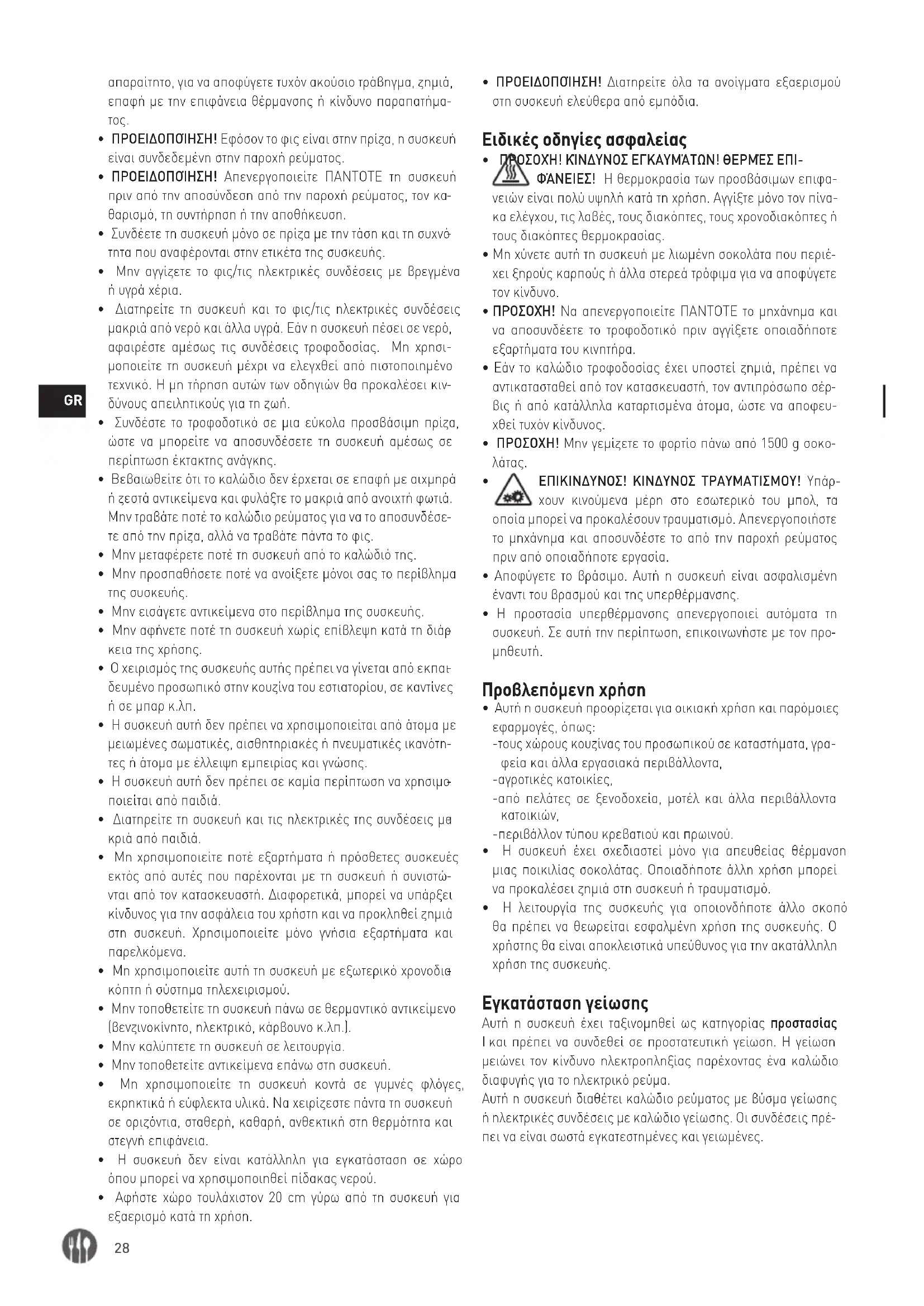 - Η συσκευή έχει σχεδιαστεί μόνο για απευθείας θέρμανση μιας ποικιλίας σοκολάτας. Οποιαδήποτε άλλη χρήση μπορεί να προκαλέσει ζημιά στη συσκευή ή τραυματισμό.