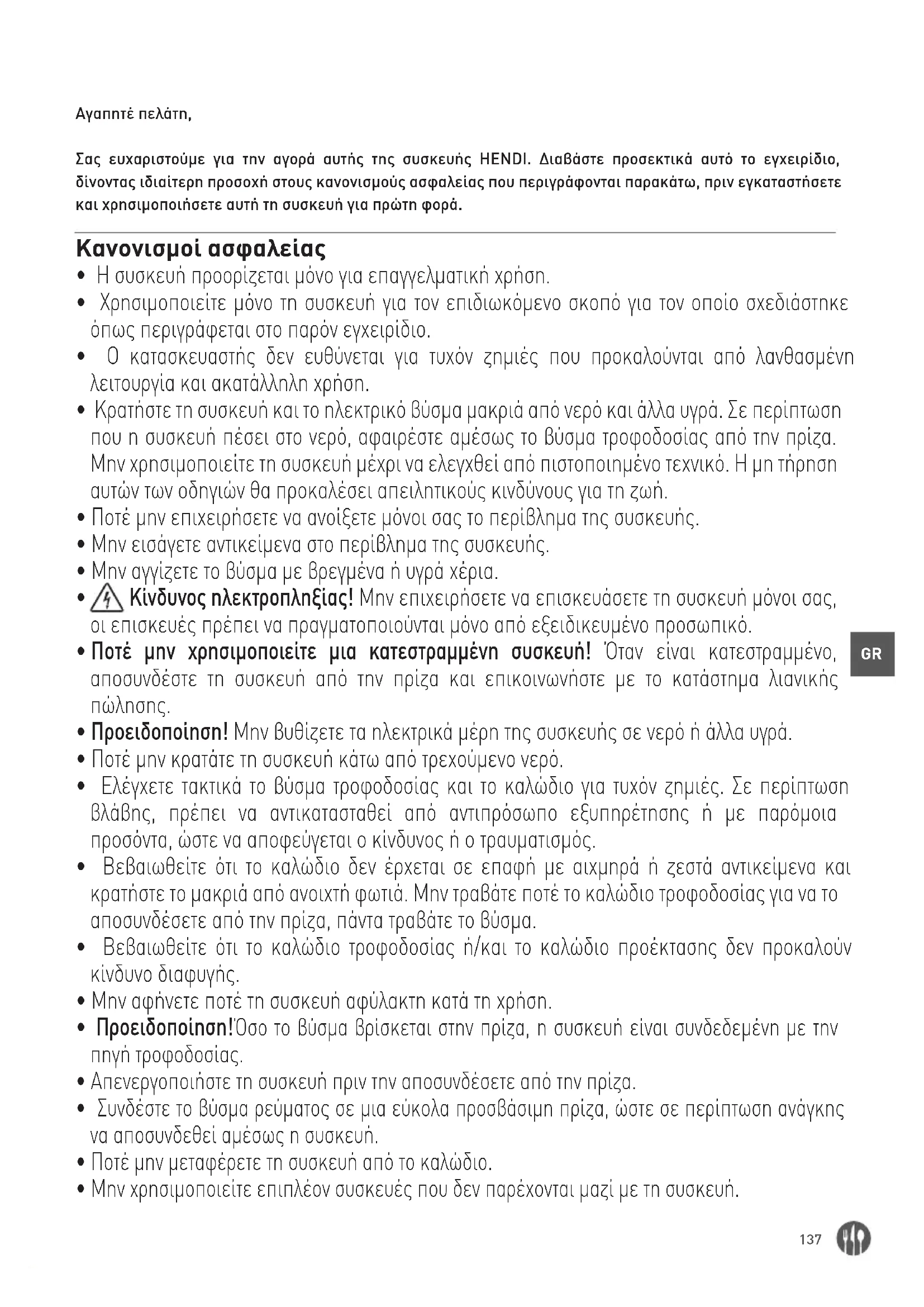 Αγαπητέ πελάτη, Σας ευχαριστούμε για την αγορά αυτής της συσκευής HENDI. Διαβάστε προσεκτικά αυτό το εγχειρίδιο, δίνοντας ιδιαίτερη προσοχή στους κανονισμούς ασφαλείας που περιγράφονται παρακάτω, πριν εγκαταστήσετε και χρησιμοποιήσετε αυτή τη συσκευή για πρώτη φορά. Κανονισμοί ασφαλείας