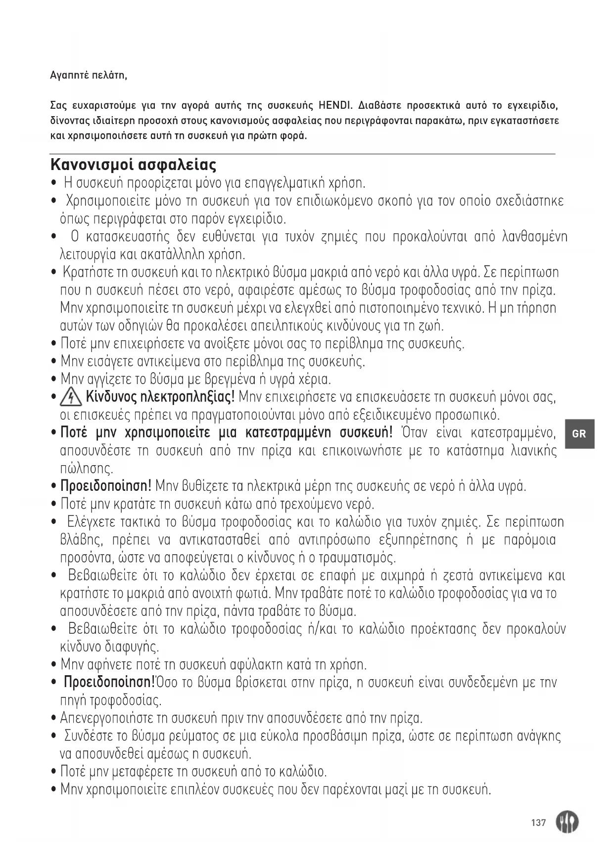 Αγαπητέ πελάτη, Σας ευχαριστούμε για την αγορά αυτής της συσκευής HENDI. Διαβάστε προσεκτικά αυτό το εγχειρίδιο, δίνοντας ιδιαίτερη προσοχή στους κανονισμούς ασφαλείας που περιγράφονται παρακάτω, πριν εγκαταστήσετε και χρησιμοποιήσετε αυτή τη συσκευή για πρώτη φορά. Κανονισμοί ασφαλείας