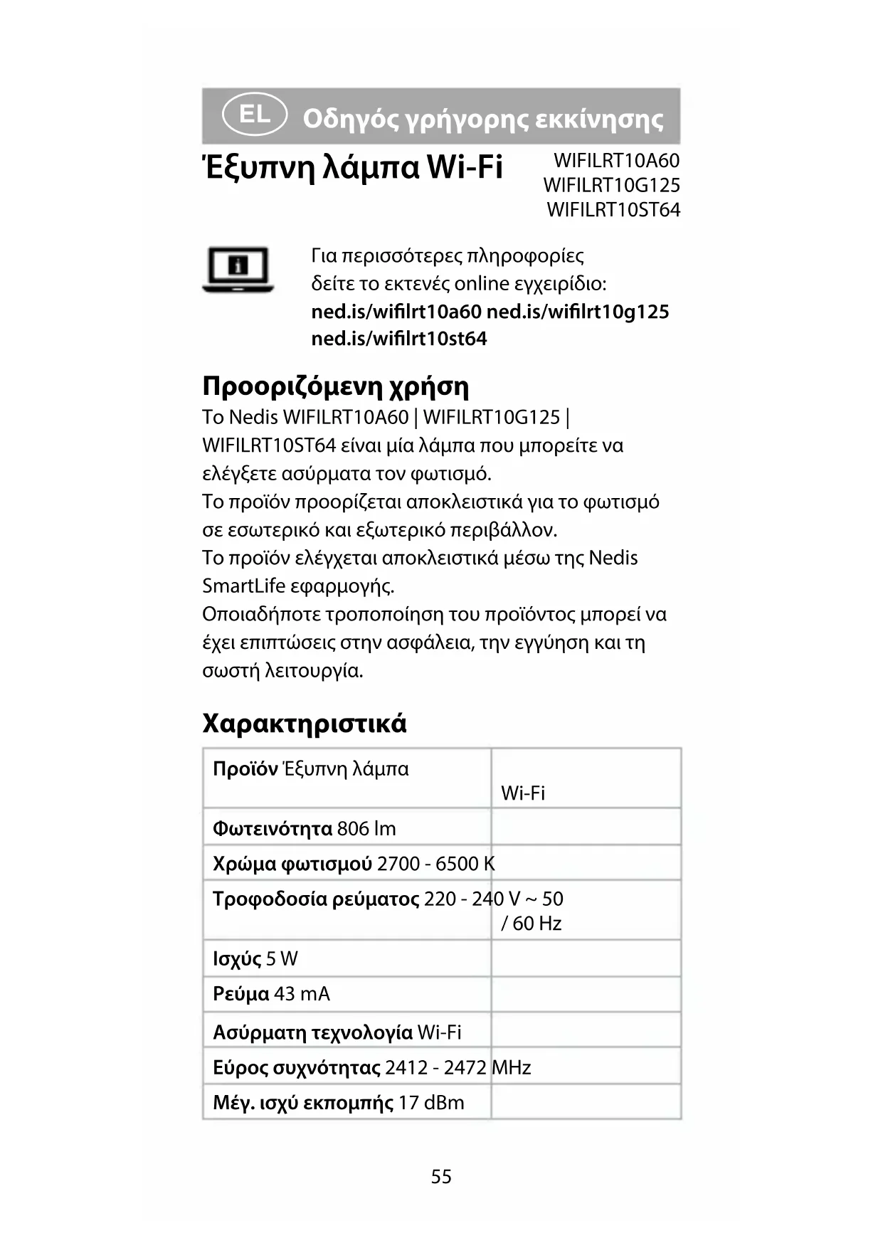 Οδηγός γρήγορης εκκίνησης Έξυπνη λάμπα Wi-Fi WIFILRT10A60 WIFILRT10G125 WIFILRT10ST64 Για περισσότερες πληροφορίες δείτε το εκτενές online εγχειρίδιο: ned.is/wilrt10a60 ned.is/wilrt10g125 ned.is/wilrt10st64 Προοριζόμενη χρήση Το Nedis WIFILRT10A60 | WIFILRT10G125 | WIFILRT10ST64 είναι μία λάμπα που μπορείτε να ελέγξετε ασύρματα τον φωτισμό. Το προϊόν προορίζεται αποκλειστικά για το φωτισμό σε εσωτερικό και εξωτερικό περιβάλλον. Το προϊόν ελέγχεται αποκλειστικά μέσω της Nedis SmartLife εφαρμογής. Οποιαδήποτε τροποποίηση του προϊόντος μπορεί να έχει επιπτώσεις στην ασφάλεια, την εγγύηση και τη σωστή λειτουργία. Χαρακτηριστικά Προϊόν Έξυπνη λάμπα Wi-Fi Φωτεινότητα 806 lm Χρώμα φωτισμού 2700 - 6500 K Τροφοδοσία ρεύματος 220 - 240 V ~ 50 / 60 Hz Ισχύς 5 W Ρεύμα 43 mA Ασύρματη τεχνολογία Wi-Fi Εύρος συχνότητας 2412 - 2472 MHz Μέγ. ισχύ εκπομπής 17 dBm56 Βάση E27 Υλικό Γυαλί Αριθμός είδους Διαστάσεις Βάρος WIFILRT10A60 Ø 60 x 105 mm 30 g WIFILRT10G125 Ø 125 x 172 mm 100 g WIFILRT10ST64 Ø 64 x 142 mm 46 g Κύρια μέρη (εικόνα A) 1 Γλόμπος 2 Νήμα πυράκτωσης 3 Ηλεκτρική επαφή Οδηγίες ασφάλειας