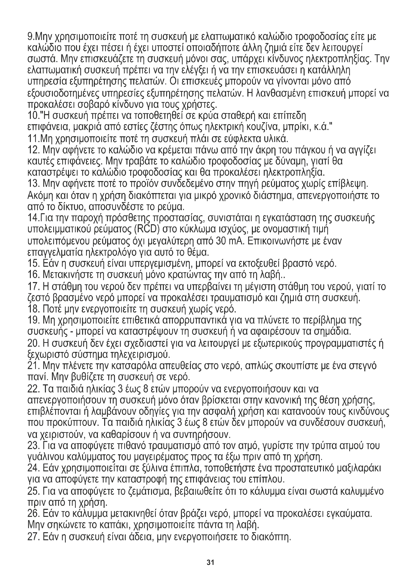4.Πρέπει να προσέχετε ιδιαιτέρως κατά τη διάρκεια χρήσης της συσκευής όταν δίπλα βρίσκονται παιδιά. Δεν επιτρέπεται τα παιδιά να παίζουν με τη συσκευή. Δεν επιτρέπεται η χρήση της συσκευής από παιδιά ή άτομα που δεν έχουν ενημερωθεί σχετικά με το χειρισμό της. 5.Η συσκευή δεν προορίζεται για χρήση από άτομα (συμπεριλαμβανομένων των παιδιών) με περιορισμένες ικανότητες κινητικές, αισθητικές και νοητικές είτε από άτομα που δεν έχουν εμπειρία ή δεν έχουν ενημερωθεί σχετικά με το χειρισμό της συσκευής, εκτός αν γίνεται αυτό υπό την εποπτεία ατόμου υπεύθυνου για την ασφάλεια τους και σύμφωνα με τις οδηγίες χρήσεως. 6.Πάντα μετά τη χρήση αποσυνδέσετε το ρευματολήπτη από το δίκτυο παροχής ρεύματος, κρατώντας την πρίζα. ΜΗΝ τραβήξετε το καλώδιο σύνδεσης. 7.Μη βάζετε το καλώδιο, το ρευματολήπτη και ολόκληρη τη συσκευή στο νερό ή άλλο υγρό. Προστατεύετε τη συσκευή από δυσμενείς καιρικές συνθήκες (βροχή, ήλιο, κ.ά.). Μην τη χρησιμοποιείτε σε συνθήκες αυξημένης υγρασίας (μπάνιο, κάμπινγκ). 8.Τακτικά πρέπει να ελέγχετε την κατάσταση του καλωδίου τροφοδοσίας. Εάν το καλώδιο τροφοδοσίας υποστεί ζημιά, πρέπει να αντικατασταθεί με ειδικό καλώδιο από την ειδική υπηρεσία εξυπηρέτησης πελατών για να αποφευχθεί κάθε κίνδυνος .