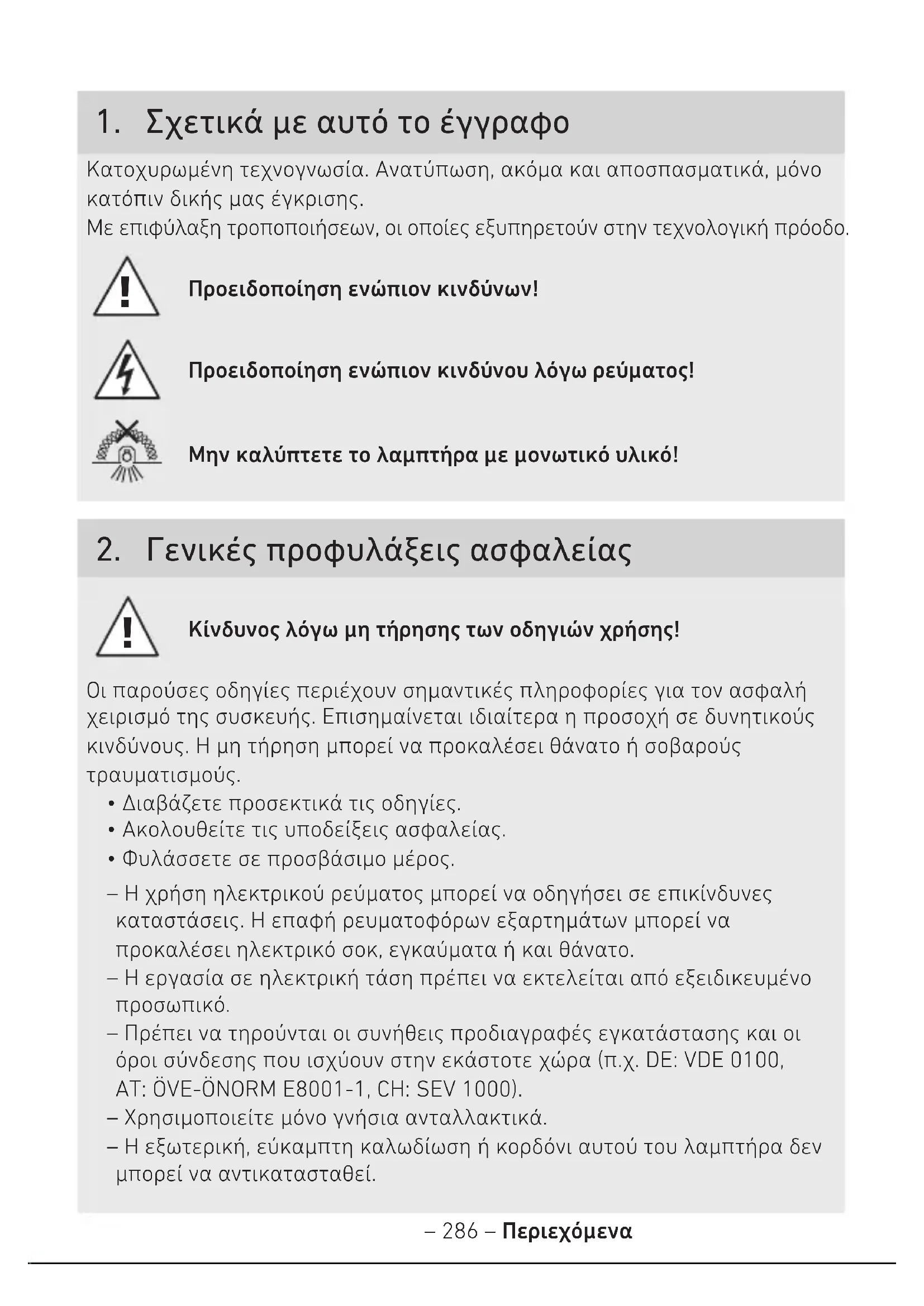 – Πρέπει να τηρούνται οι συνήθεις προδιαγραφές εγκατάστασης και οι όροι σύνδεσης που ισχύουν στην εκάστοτε χώρα (π.χ. DE: VDE 0100, AT:ÖVE-ÖNORM E8001-1, CH:SEV1000). – Χρησιμοποιείτε μόνο γνήσια ανταλλακτικά. – Η εξωτερική, εύκαμπτη καλωδίωση ή κορδόνι αυτού του λαμπτήρα δεν μπορεί να αντικατασταθεί.– 287 – Περιεχόμενα
