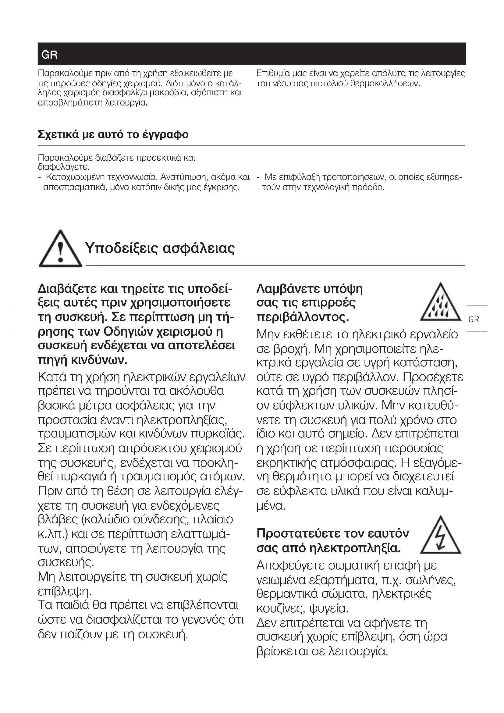 Υποδείξεις ασφάλειας Παρακαλούμε πριν από τη χρήση εξοικειωθείτε με τις παρούσες οδηγίες χειρισμού. Διότι μόνο ο κατάλ- ληλος χειρισμός διασφαλίζει μακρόβια, αξιόπιστη και απροβλημάτιστη λειτουργία. Επιθυμία μας είναι να χαρείτε απόλυτα τις λειτουργίες του νέου σας πιστολιού θερμοκολλήσεων. GRΠρωτότυπο οδηγιών χειρισμού Σχετικά με αυτό το έγγραφο Παρακαλούμε διαβάζετε προσεκτικά και διαφυλάγετε. - Κατοχυρωμένη τεχνογνωσία. Ανατύπωση, ακόμα και αποσπασματικά, μόνο κατόπιν δικής μας έγκρισης. - Με επιφύλαξη τροποποιήσεων, οι οποίες εξυπηρε- τούν στην τεχνολογική πρόοδο. Διαβάζετε και τηρείτε τις υποδεί- ξεις αυτές πριν χρησιμοποιήσετε τη συσκευή. Σε περίπτωση μη τή- ρησης των Οδηγιών χειρισμού η συσκευή ενδέχεται να αποτελέσει πηγή κινδύνων. Κατά τη χρήση ηλεκτρικών εργαλείων πρέπει να τηρούνται τα ακόλουθα βασικά μέτρα ασφάλειας για την προστασία έναντι ηλεκτροπληξίας, τραυματισμών και κινδύνων πυρκαϊάς. Σε περίπτωση απρόσεκτου χειρισμού της συσκευής, ενδέχεται να προκλη- θεί πυρκαγιά ή τραυματισμός ατόμων. Πριν από τη θέση σε λειτουργία ελέγ- χετε τη συσκευή για ενδεχόμενες βλάβες (καλώδιο σύνδεσης, πλαίσιο κ.λπ.) και σε περίπτωση ελαττωμά- των, αποφύγετε τη λειτουργία της