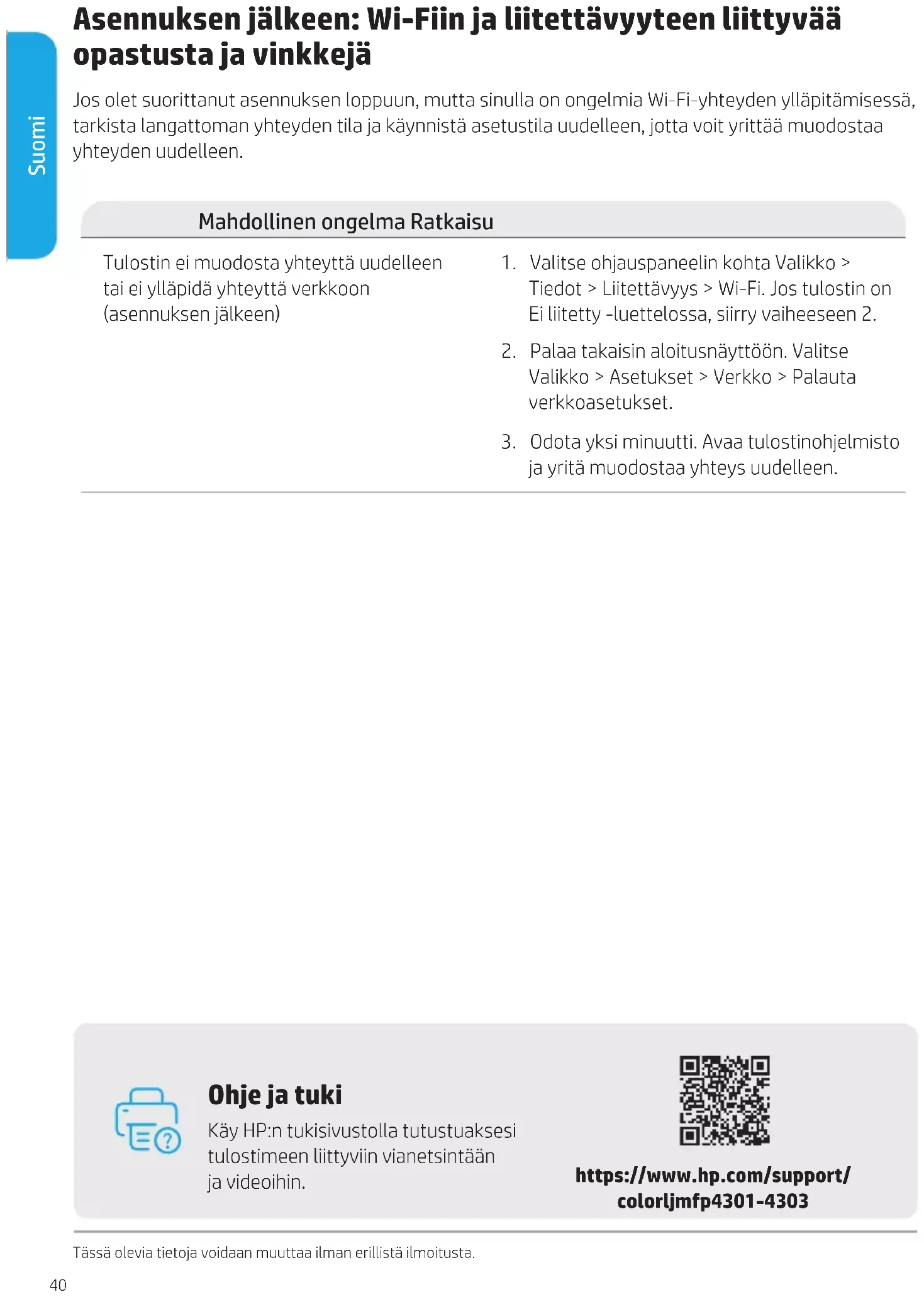 Μετά την εγκατάσταση: Βοήθεια και συμβουλές για το Wi-Fi και τη συνδεσιμότητα Εάν ολοκληρώσατε την εγκατάσταση αλλά έχετε προβλήματα με τη διατήρηση μιας σύνδεσης Wi-Fi, ελέγξτε την κατάσταση ασύρματου δικτύου και επανεκκινήστε τη λειτουργία εγκατάστασης για να επιχειρήσετε να συνδεθείτε ξανά. Πιθανό πρόβλημα Λύση Ο εκτυπωτής δεν επανασυνδέεται ή δεν μπορείνα διατηρήσει μια σύνδεση στο δίκτυο(μετά την εγκατάσταση)