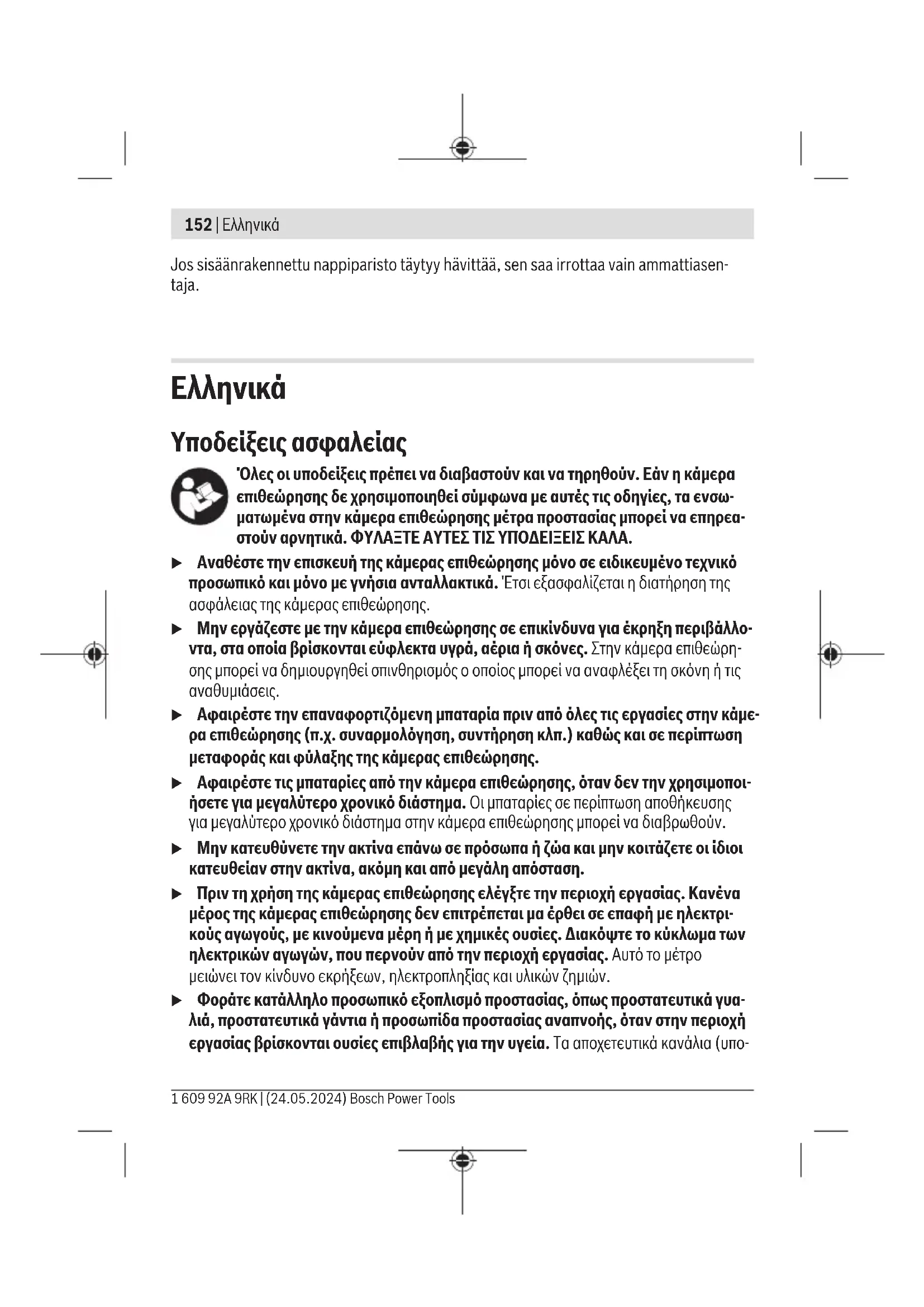 Υποδείξεις ασφαλείας Όλες οι υποδείξεις πρέπει να διαβαστούν και να τηρηθούν. Εάν η κάμερα επιθεώρησης δε χρησιμοποιηθεί σύμφωνα με αυτές τις οδηγίες, τα ενσω- ματωμένα στην κάμερα επιθεώρησης μέτρα προστασίας μπορεί να επηρεα- στούν αρνητικά. ΦΥΛΑΞΤΕ ΑΥΤΕΣ ΤΙΣ ΥΠΟΔΕΙΞΕΙΣ ΚΑΛΑ. u Αναθέστε την επισκευή της κάμερας επιθεώρησης μόνο σε ειδικευμένο τεχνικό προσωπικό και μόνο με γνήσια ανταλλακτικά. Έτσι εξασφαλίζεται η διατήρηση της ασφάλειας της κάμερας επιθεώρησης. u Μην εργάζεστε με την κάμερα επιθεώρησης σε επικίνδυνα για έκρηξη περιβάλλο- ντα, στα οποία βρίσκονται εύφλεκτα υγρά, αέρια ή σκόνες. Στην κάμερα επιθεώρη- σης μπορεί να δημιουργηθεί σπινθηρισμός ο οποίος μπορεί να αναφλέξει τη σκόνη ή τις αναθυμιάσεις. u Αφαιρέστε την επαναφορτιζόμενη μπαταρία πριν από όλες τις εργασίες στην κάμε- ρα επιθεώρησης (π.χ. συναρμολόγηση, συντήρηση κλπ.) καθώς και σε περίπτωση μεταφοράς και φύλαξης της κάμερας επιθεώρησης. u Αφαιρέστε τις μπαταρίες από την κάμερα επιθεώρησης, όταν δεν την χρησιμοποι- ήσετε για μεγαλύτερο χρονικό διάστημα. Οι μπαταρίες σε περίπτωση αποθήκευσης για μεγαλύτερο χρονικό διάστημα στην κάμερα επιθεώρησης μπορεί να διαβρωθούν. u Μην κατευθύνετε την ακτίνα επάνω σε πρόσωπα ή ζώα και μην κοιτάζετε οι ίδιοι κατευθείαν στην ακτίνα, ακόμη και από μεγάλη απόσταση. u Πριν τη χρήση της κάμερας επιθεώρησης ελέγξτε την περιοχή εργασίας. Κανένα μέρος της κάμερας επιθεώρησης δεν επιτρέπεται μα έρθει σε επαφή με ηλεκτρι- κούς αγωγούς, με κινούμενα μέρη ή με χημικές ουσίες. Διακόψτε το κύκλωμα των ηλεκτρικών αγωγών, που περνούν από την περιοχή εργασίας. Αυτό το μέτρο μειώνει τον κίνδυνο εκρήξεων, ηλεκτροπληξίας και υλικών ζημιών. u Φοράτε κατάλληλο προσωπικό εξοπλισμό προστασίας, όπως προστατευτικά γυα- λιά, προστατευτικά γάντια ή προσωπίδα προστασίας αναπνοής, όταν στην περιοχή εργασίας βρίσκονται ουσίες επιβλαβής για την υγεία. Τα αποχετευτικά κανάλια (υπο- 1 609 92A 9RK | (24.05.2024) Bosch Power ToolsΕλληνικά | 153 νόμοι) ή παρόμοιες περιοχές μπορεί να περιέχουν στερεές, υγρές ή αέριες ουσίες που εί- ναι τοξικές, μολυσματικές, διαβρωτικές ή με άλλο τρόπο επικίνδυνες για την υγεία. u Προσέχετε ιδιαίτερα την καθαριότητα, όταν εργάζεστε σε περιοχές με επιβλαβείς για την υγεία ουσίες. Μην τρώτε κατά τη διάρκεια της εργασίας. Αποφεύγετε την επαφή με τις επιβλαβείς για την υγεία ουσίες και καθαρίζετε μετά την εργασία τα χέρια και τα άλλα μέρη του σώματος, που μπορεί να ήρθαν σε επαφή, με ζεστή σαπουνάδα. Έτσι μειώνεται ο κίνδυνος για την υγεία. u Μη στέκεστε στο νερό, όταν χρησιμοποιείτε την κάμερα επιθεώρησης. Με την ερ- γασία στο νερό υπάρχει ο κίνδυνος ηλεκτροπληξίας. u Μην τροποποιήσετε και μην ανοίξετε την μπαταρία. Υπάρχει κίνδυνος βραχυκυ-