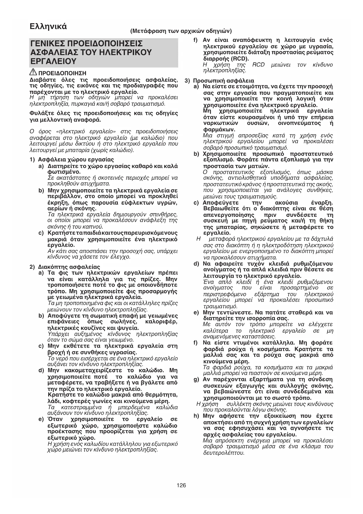 a) Τα φις των ηλεκτρικών εργαλείων πρέπει να είναι κατάλληλα για τις πρίζες. Μην τροποποιήσετε ποτέ το φις με οποιονδήποτε τρόπο. Μη χρησιμοποιείτε φις προσαρμογής με γειωμένα ηλεκτρικά εργαλεία. Τα μη τροποποιημένα φις και οι κατάλληλες πρίζες μειώνουν τον κίνδυνο ηλεκτροπληξίας. b) Αποφύγετε τη σωματική επαφή με γειωμένες επιφάνειες όπως σωλήνες, καλοριφέρ, ηλεκτρικές κουζίνες και ψυγεία. Υπάρχει αυξημένος κίνδυνος ηλεκτροπληξίας όταν το σώμα σας είναι γειωμένο. c) Μην εκθέτετε τα ηλεκτρικά εργαλεία στη βροχή ή σε συνθήκες υγρασίας. Το νερό που εισέρχεται σε ένα ηλεκτρικό εργαλείο αυξάνει τον κίνδυνο ηλεκτροπληξίας. d) Μην κακομεταχειρίζεστε το καλώδιο. Μη χρησιμοποιείτε ποτέ το καλώδιο για να μεταφέρετε, να τραβήξετε ή να βγάλετε από την πρίζα το ηλεκτρικό εργαλείο. Κρατήστε το καλώδιο μακριά από θερμότητα, λάδι, κοφτερές γωνίες και κινούμενα μέρη. Τα κατεστραμμένα ή μπερδεμένα καλώδια αυξάνουν τον κίνδυνο ηλεκτροπληξίας. e) Όταν χρησιμοποιείτε το εργαλείο σε εξωτερικό χώρο, χρησιμοποιήστε καλώδιο προέκτασης που προορίζεται για χρήση σε εξωτερικό χώρο. Η χρήση ενός καλωδίου κατάλληλου για εξωτερικό χώρο μειώνει τον κίνδυνο ηλεκτροπληξίας. (Μετάφραση των αρχικών οδηγιών) 000BookG1812DAEU.indb126000BookG1812DAEU.indb126 2022/08/3015:34:512022/08/3015:34:51127