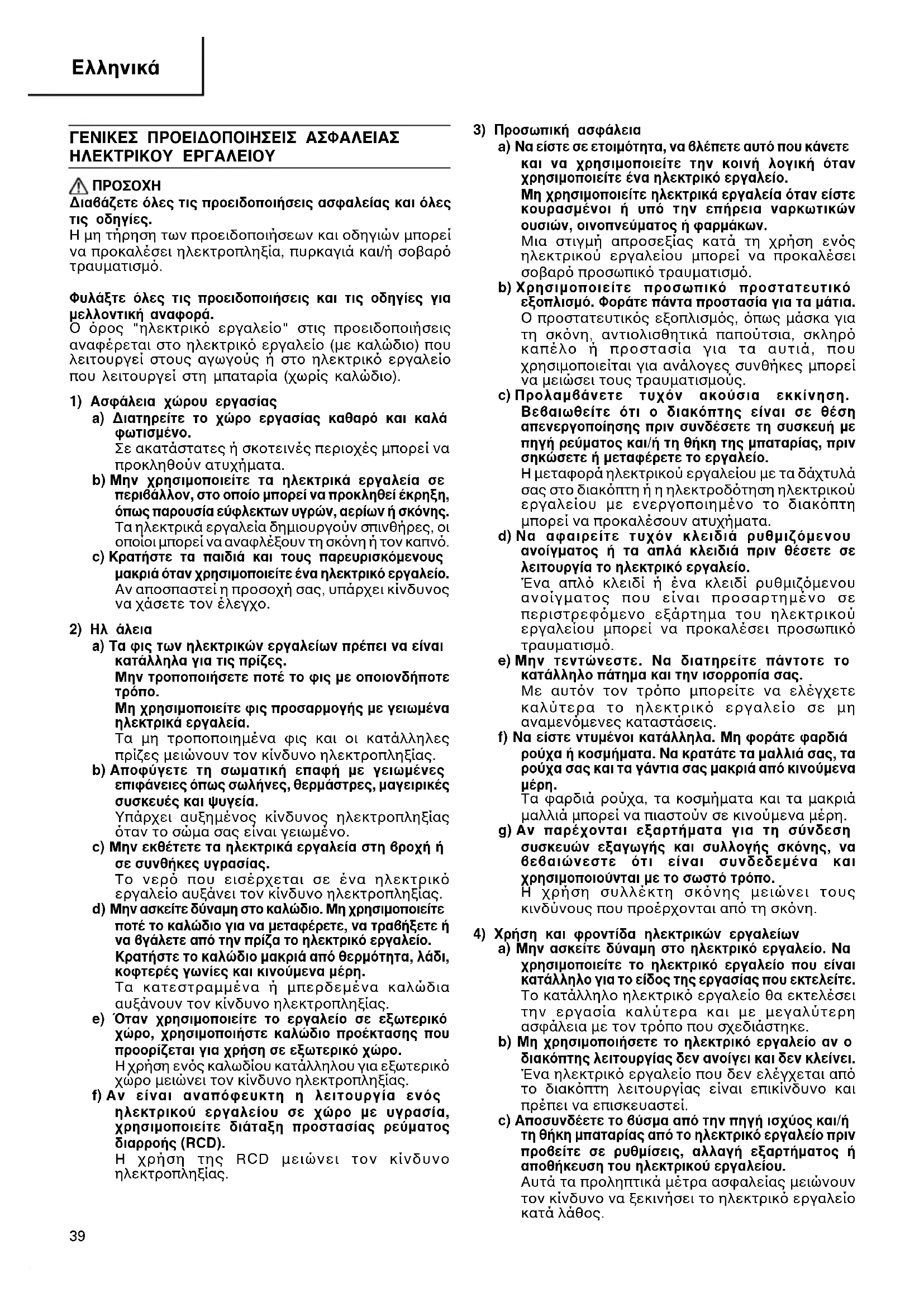 a) ∆· ÊȘ ÙˆÓ ËÏÂÎÙÚÈÎÒÓ ÂÚÁ·Ï›ˆÓ Ú¤ÂÈ Ó· Â›Ó·È Î·Ù¿ÏÏËÏ· ÁÈ· ÙȘ Ú›˙˜. ªËÓ ÙÚÔÔÔÈ‹ÛÂÙ ÔÙ¤ ÙÔ ÊȘ Ì ÔÔÈÔÓ‰‹ÔÙ ÙÚfiÔ. ªË ¯ÚËÛÈÌÔÔț٠ÊȘ ÚÔÛ·ÚÌÔÁ‹˜ Ì ÁÂȈ̤ӷ ËÏÂÎÙÚÈο ÂÚÁ·Ï›·. Τα µη τροποποιηµένα φις και οι κατάλληλες πρίζες µειώνουν τον κίνδυνο ηλεκτροπληξίας. b) ∞ÔʇÁÂÙ ÙË ÛˆÌ·ÙÈ΋ ·ʋ Ì ÁÂȈ̤Ó˜ ÂÈÊ¿ÓÂȘ fiˆ˜ ۈϋÓ˜, ıÂÚÌ¿ÛÙÚ˜, Ì·ÁÂÈÚÈΤ˜ Û˘Û΢¤˜ Î·È „˘Á›·. Υπάρχει αυξηµένος κίνδυνος ηλεκτροπληξίας ταν το σώµα σας είναι γειωµένο. c) ªËÓ ÂÎı¤ÙÂÙ ٷ ËÏÂÎÙÚÈο ÂÚÁ·Ï›· ÛÙË ‚ÚÔ¯‹ ‹ ÛÂ Û˘Óı‹Î˜ ˘ÁÚ·Û›·˜. Το νερ που εισέρχεται σε ένα ηλεκτρικ εργαλείο αυξάνει τον κίνδυνο ηλεκτροπληξίας. d) ªËÓ ·ÛΛ٠‰‡Ó·ÌË ÛÙÔ Î·ÏÒ‰ÈÔ. ªË ¯ÚËÛÈÌÔÔț٠ÔÙ¤ ÙÔ Î·ÏÒ‰ÈÔ ÁÈ· Ó· ÌÂٷʤÚÂÙÂ, Ó· ÙÚ·‚‹ÍÂÙ ‹ Ó· ‚Á¿ÏÂÙ ·fi ÙËÓ Ú›˙· ÙÔ ËÏÂÎÙÚÈÎfi ÂÚÁ·Ï›Ô. ∫Ú·Ù‹ÛÙ ÙÔ Î·ÏÒ‰ÈÔ Ì·ÎÚÈ¿ ·fi ıÂÚÌfiÙËÙ·, Ï¿‰È, ÎÔÊÙÂÚ¤˜ ÁˆÓ›Â˜ Î·È ÎÈÓÔ‡ÌÂÓ· ̤ÚË. Τα κατεστραµµένα ή µπερδεµένα καλώδια αυξάνουν τον κίνδυνο ηλεκτροπληξίας. e) ŸÙ·Ó ¯ÚËÛÈÌÔÔț٠ÙÔ ÂÚÁ·ÏÂ›Ô Û Â͈ÙÂÚÈÎfi ¯ÒÚÔ, ¯ÚËÛÈÌÔÔÈ‹ÛÙ ηÏÒ‰ÈÔ ÚÔ¤ÎÙ·Û˘ Ô˘ ÚÔÔÚ›˙ÂÙ·È ÁÈ· ¯Ú‹ÛË Û Â͈ÙÂÚÈÎfi ¯ÒÚÔ. Η χρήση ενς καλωδίου κατάλληλου για εξωτερικ χώρο µειώνει τον κίνδυνο ηλεκτροπληξίας. f) ∞Ó Â›Ó·È ·Ó·fiÊ¢ÎÙË Ë ÏÂÈÙÔ˘ÚÁ›· ÂÓfi˜ ËÏÂÎÙÚÈÎÔ‡ ÂÚÁ·Ï›Ԣ Û ¯ÒÚÔ Ì ˘ÁÚ·Û›·, ¯ÚËÛÈÌÔÔț٠‰È¿Ù·ÍË ÚÔÛÙ·Û›·˜ Ú‡̷ÙÔ˜ ‰È·ÚÚÔ‹˜ (RCD). Η χρήση της RCD µειώνει τον κίνδυνο ηλεκτροπληξίας.