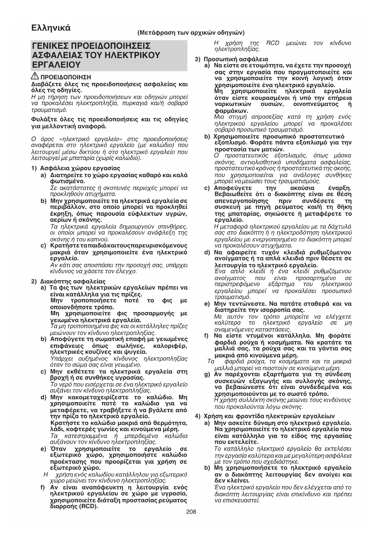 χρήση ενός καλωδίου κατάλληλου για εξωτερικό χώρο μειώνει τον κίνδυνο ηλεκτροπληξίας. f) Αν είναι αναπόφευκτη η λειτουργία ενός ηλεκτρικού εργαλείου σε χώρο με υγρασία, χρησιμοποιείτε διάταξη προστασίας ρεύματος διαρροής (RCD). (Μετάφραση των αρχικών οδηγιών) 000BookNT1865DBAL.indb208000BookNT1865DBAL.indb208 2022/06/2911:55:262022/06/2911:55:26209