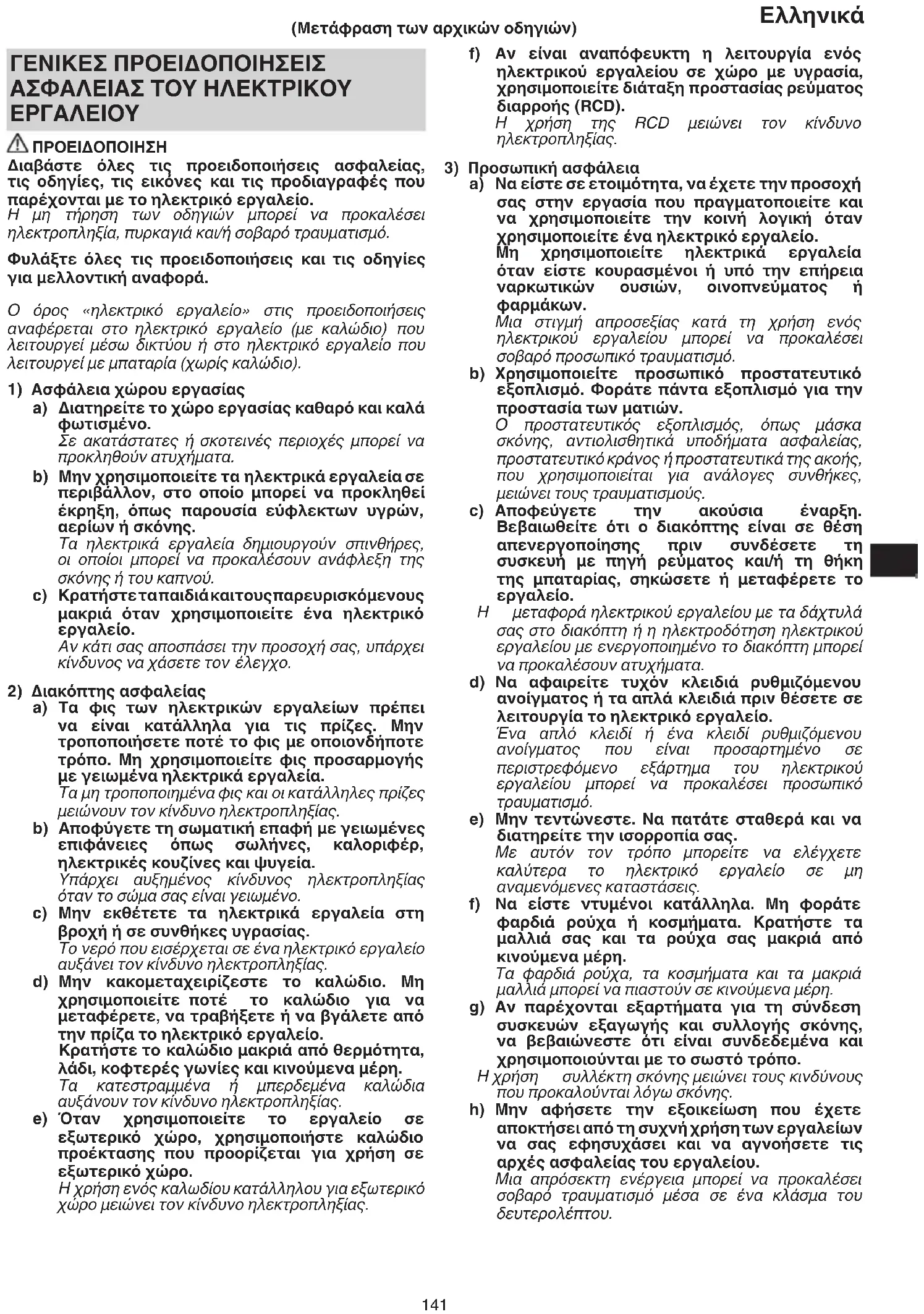 f) Αν είναι αναπόφευκτη η λειτουργία ενός ηλεκτρικού εργαλείου σε χώρο με υγρασία, χρησιμοποιείτε διάταξη προστασίας ρεύματος διαρροής (RCD). Η χρήση της RCD μειώνει τον κίνδυνο ηλεκτροπληξίας.
