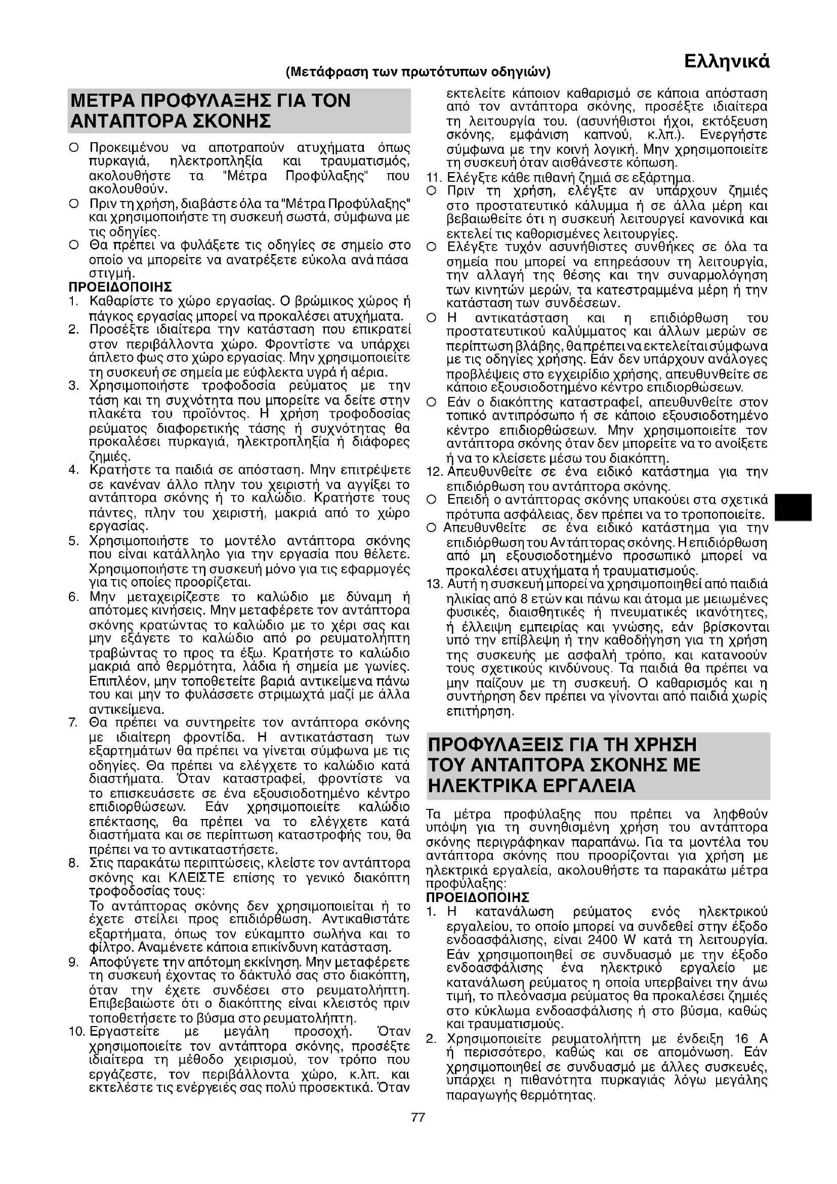 ΠΡΟΦΥΛΑΞΕΙΣ ΓΙΑ ΤΗ ΧΡΗΣΗ ΤΟΥ ΑΝΤΑΠΤΟΡΑ ΣΚΟΝΗΣ ΜΕ ΗΛΕΚΤΡΙΚΑ ΕΡΓΑΛΕΙΑ Τα μέτρα προφύλαξης που πρέπει να ληφθούν υπόψη για τη συνηθισμένη χρήση του αντάπτορα σκόνης περιγράφηκαν παραπάνω. Γι α τα μοντέλα του αντάπτορα σκόνης που προορίζονται για χρήση με ηλεκτρικά εργαλεία, ακολουθήστε τα παρακάτω μέτρα προφύλαξης: ΠΡΟΕΙΔΟΠΟΙΗΣ