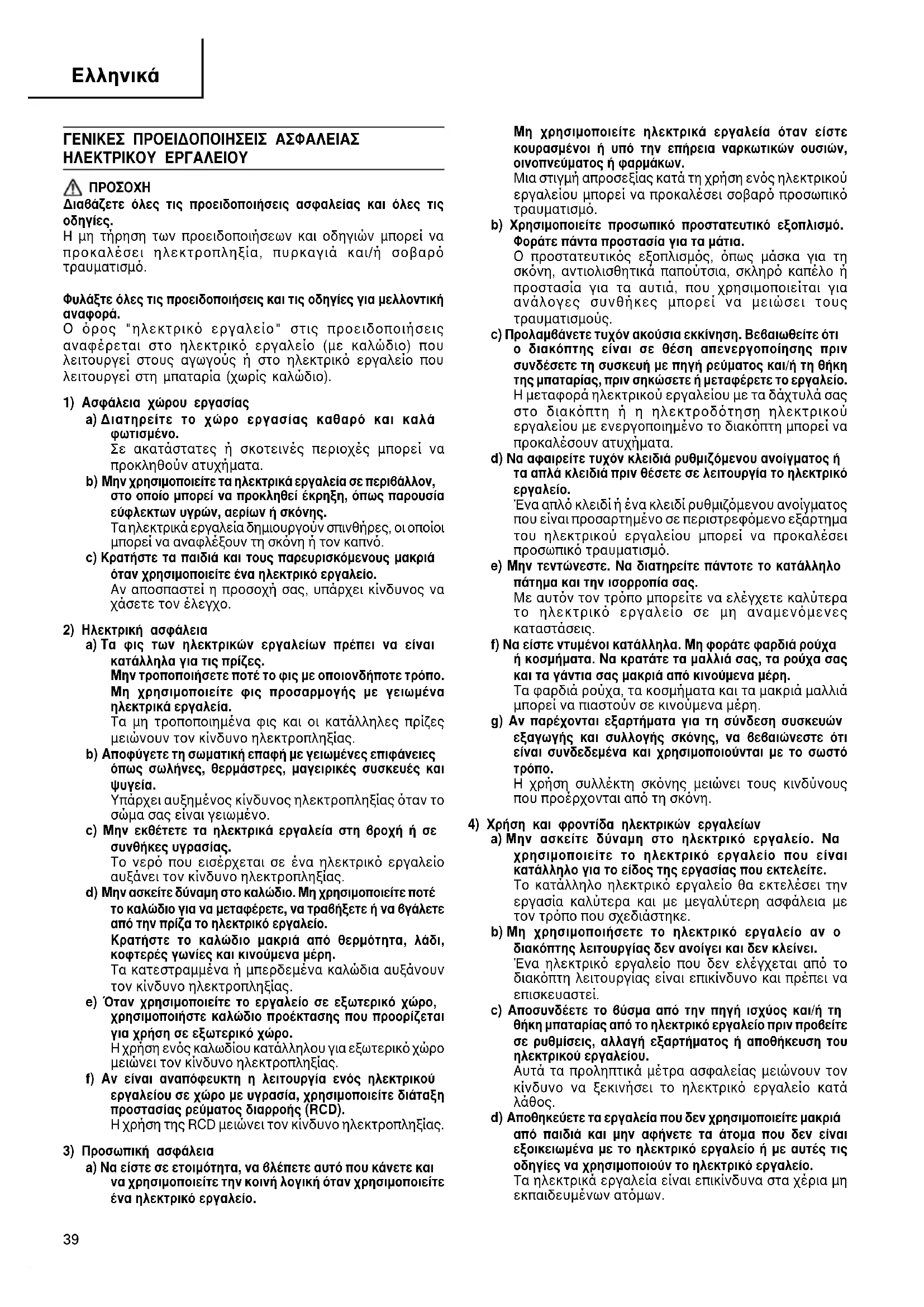 - ÓÙ·ÏÏ·ÎÙÈο. Με αυτν τον τρπο είστε σίγουροι για την ασφάλεια του ηλεκτρικού εργαλείου. ¶ƒ√ºÀ§∞•∏ ª·ÎÚÈ¿ ·fi Ù· ·È‰È¿ Î·È ÙÔ˘˜ ·Ó·‹ÚÔ˘˜. ŸÙ·Ó ‰ÂÓ ¯ÚËÛÈÌÔÔÈÔ‡ÓÙ·È, Ù· ÂÚÁ·Ï›· Ú¤ÂÈ Ó· Ê˘Ï¿˙ÔÓÙ·È Ì·ÎÚÈ¿ ·fi Ù· ·È‰È¿ Î·È ÙÔ˘˜ ·Ó·‹ÚÔ˘˜. °∂¡π∫∂™ √¢∏°π∂™ ∞™º∞§∂π∞™ °π∞ ∂ƒ°∞™π∂™ ∆ƒπµ∏™ a) ∞˘Ùfi ÙÔ ÂÚÁ·ÏÂ›Ô ÚÔÔÚ›˙ÂÙ·È ÌfiÓÔ ÁÈ· ÂÚÁ·Û›Â˜ ÙÚÈ‚‹˜. ¢È·‚¿˙ÂÙ fiϘ ÚÔÂȉÔÔÈ‹ÛÂȘ ·ÛÊ·Ï›·˜, ÙȘ Ô‰ËÁ›Â˜, ÙȘ ÂÈÎfiÓ˜ Î·È ÙȘ ÚԉȷÁڷʤ˜ Ô˘ ·Ú¤¯ÔÓÙ·È Ì ÙÔ ËÏÂÎÙÚÈÎfi ÂÚÁ·Ï›Ô. Η µη τήρηση των οδηγιών που αναφέρονται παρακάτω µπορεί να προκαλέσει ηλεκτροπληξία, πυρκαγιά και/ή σοβαρ τραυµατισµ. b) OÈ ÂÚÁ·Û›Â˜ ÙÚÔ¯ÈÛÌÔ‡, ÁÈ·ÏÔÙÚÔ¯›ÛÌ·ÙÔ˜, ‚Ô˘ÚÙÛ›ÛÌ·ÙÔ˜ ‹ ÎÔ‹˜ ‰ÂÓ ı· Ú¤ÂÈ Ó· ÂÎÙÂÏÔ‡ÓÙ·È Ì ·˘Ùfi ÙÔ ÂÚÁ·Ï›Ô. Ενέργειες για τις οποίες δεν σχεδιάστηκε το ηλεκτρικ εργαλείο µπορούν να αποτελέσουν κίνδυνο και να προκαλέσουν τραυµατισµ. c) ªËÓ ¯ÚËÛÈÌÔÔț٠ÂÍ·ÚÙ‹Ì·Ù· Ô˘ ‰ÂÓ Â›Ó·È ÂȉÈο ۯ‰ȷṲ̂ӷ Î·È ‰ÂÓ Û˘ÓÈÛÙÒÓÙ·È ·fi ÙÔÓ Î·Ù·Û΢·ÛÙ‹. Το γεγονς τι το εξάρτηµα προσαρτάται στο ηλεκτρικ σας εργαλείο δεν σηµαίνει τι έτσι διασφαλίζεται η ασφαλής λειτουργία του. d) ∏ ÔÓÔÌ·ÛÙÈ΋ Ù·¯‡ÙËÙ· ÙÔ˘ ÂÍ·ÚÙ‹Ì·ÙÔ˜ Ú¤ÂÈ Ó· ÈÛÔ‰˘Ó·Ì› ÙÔ˘Ï¿¯ÈÛÙÔÓ Ì ÙË Ì¤ÁÈÛÙË Ù·¯‡ÙËÙ· Ô˘