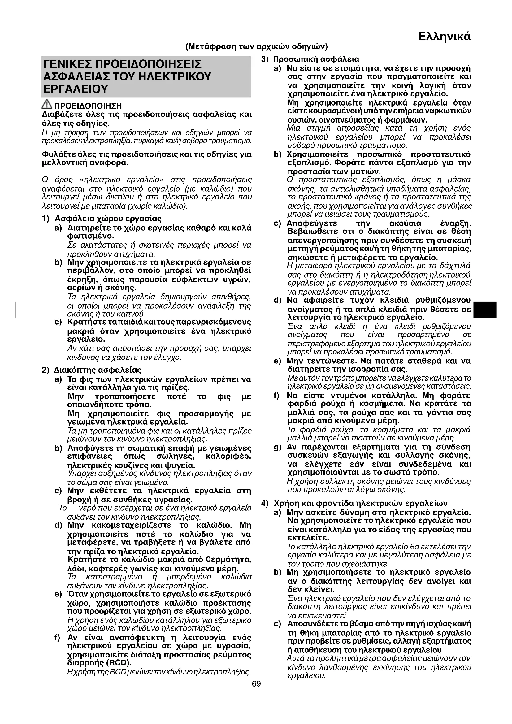 ΠΡΟΕΙΔΟΠΟΙΗΣΗ Διαβάζετε όλες τις προειδοποιήσεις ασφαλείας και όλες τις οδηγίες. Η μη τήρηση των προειδοποιήσεων και οδηγιών μπορεί να προκαλέσει ηλεκτροπληξία, πυρκαγιά και/ή σοβαρό τραυματισμό. Φυλάξτε όλες τις προειδοποιήσεις και τις οδηγίες για μελλοντική αναφορά. Ο όρος «ηλεκτρικό εργαλείο» στις προειδοποιήσεις αναφέρεται στο ηλεκτρικό εργαλείο (με καλώδιο) που λειτουργεί μέσω δικτύου ή στο ηλεκτρικό εργαλείο που λειτουργεί με μπαταρία (χωρίς καλώδιο).