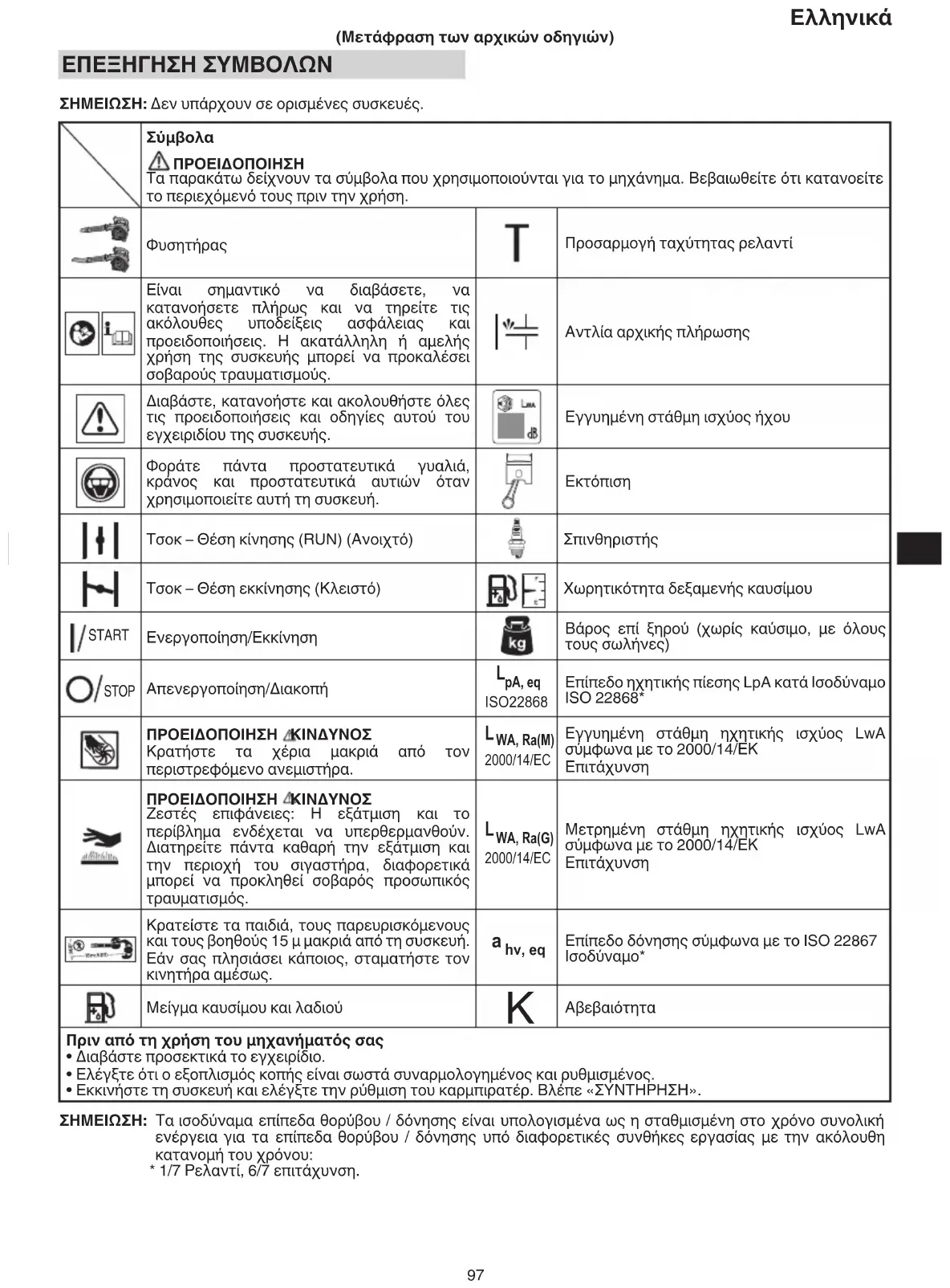 Προσαρμογή ταχύτητας ρελαντί Είναι σημαντικό να διαβάσετε, να κατανοήσετε πλήρως και να τηρείτε τις ακόλουθες υποδείξεις ασφάλειας και προειδοποιήσεις. Η ακατάλληλη ή αμελής χρήση της συσκευής μπορεί να προκαλέσει σοβαρούς τραυματισμούς. Αντλία αρχικής πλήρωσης Διαβάστε, κατανοήστε και ακολουθήστε όλες τις προειδοποιήσεις και οδηγίες αυτού του εγχειριδίου της συσκευής. Εγγυημένη στάθμη ισχύος ήχου Φοράτε πάντα προστατευτικά γυαλιά, κράνος και προστατευτικά αυτιών όταν χρησιμοποιείτε αυτή τη συσκευή.