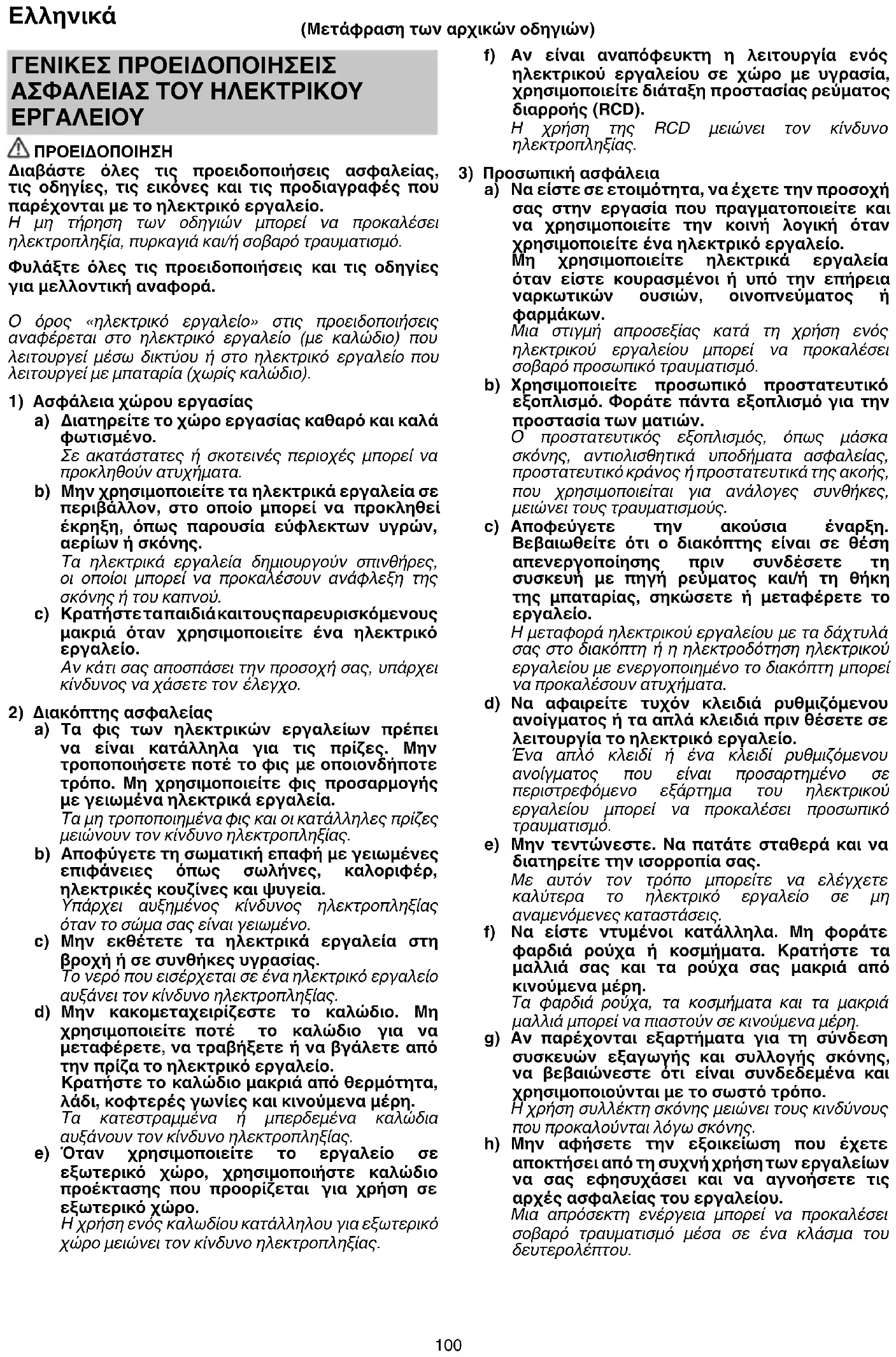 (Μετάφραση των αρχικών οδηγιών) ΓΕΝΙΚΕΣ ΠΡΟΕΙΔΟΠΟΙΗΣΕΙΣ ΑΣΦΑΛΕΙΑΣ ΤΟΥ ΗΛΕΚΤΡΙΚΟΥ