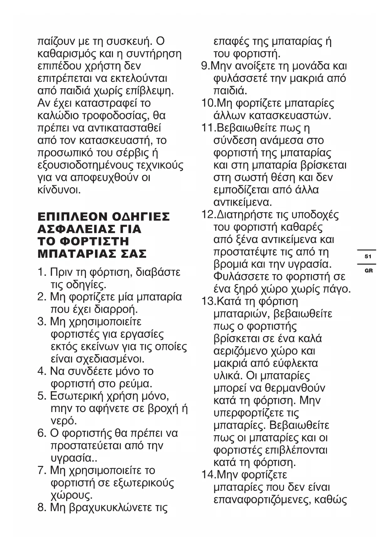 10.Μη φορτίζετε μπαταρίες άλλων κατασκευαστών. 11.Βεβαιωθείτε πως η σύνδεση ανάμεσα στο φορτιστή της μπαταρίας και στη μπαταρία βρίσκεται στη σωστή θέση και δεν εμποδίζεται από άλλα αντικείμενα. 12.Διατηρήστε τις υποδοχές του φορτιστή καθαρές από ξένα αντικείμενα και προστατέψτε τις από τη βρομιά και την υγρασία. Φυλάσσετε το φορτιστή σε ένα ξηρό χώρο χωρίς πάγο. 13.Κατά τη φόρτιση μπαταριών, βεβαιωθείτε πως ο φορτιστής βρίσκεται σε ένα καλά αεριζόμενο χώρο και μακριά από εύφλεκτα υλικά. Οι μπαταρίες μπορεί να θερμανθούν κατά τη φόρτιση. Μην υπερφορτίζετε τις μπαταρίες. Βεβαιωθείτε πως οι μπαταρίες και οι φορτιστές επιβλέπονται κατά τη φόρτιση. 14.Μην φορτίζετε μπαταρίες που δεν είναι επαναφορτιζόμενες, καθώς52