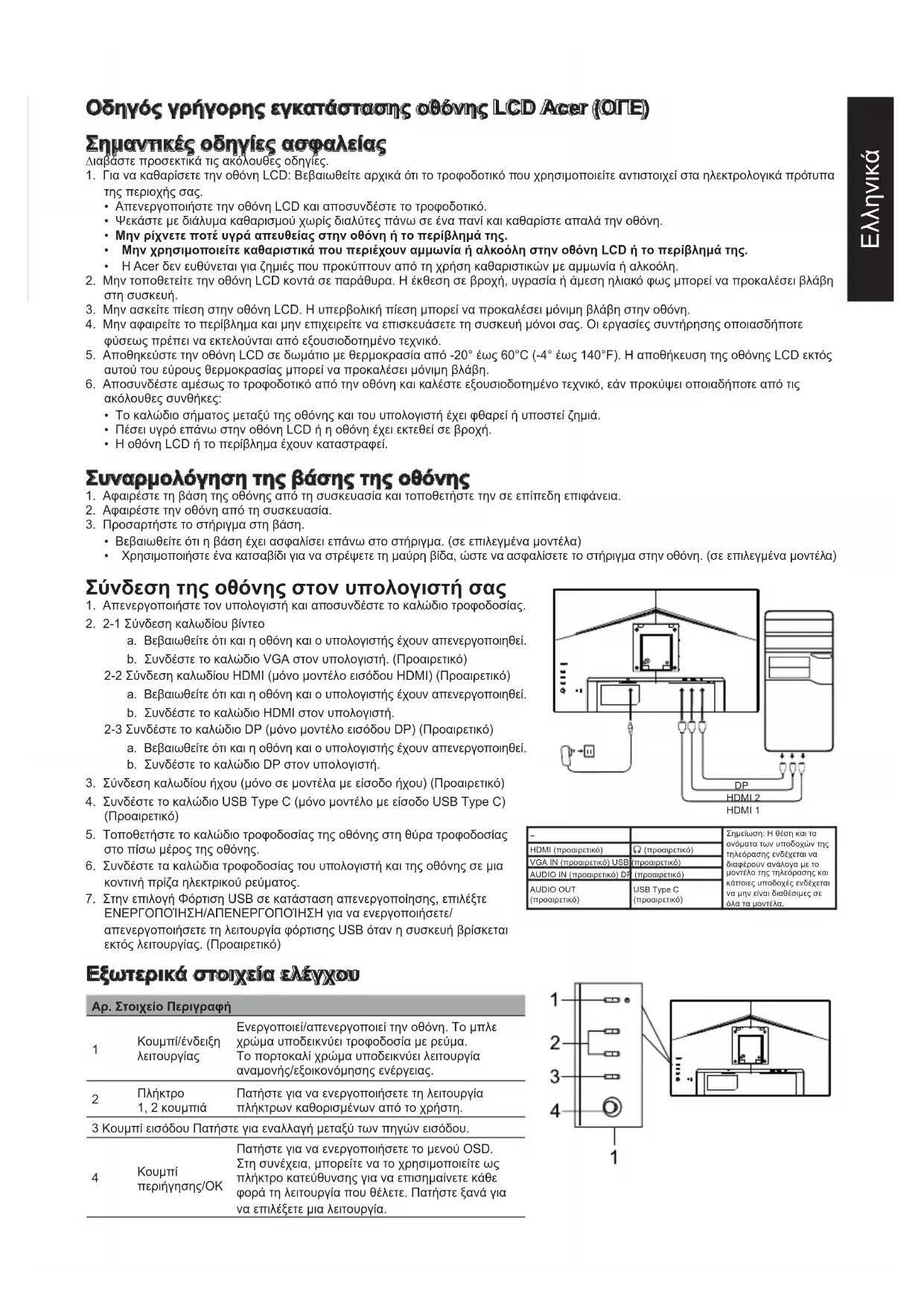 Οποιεσδήποτε αλλαγές ή τροποποιήσεις που δεν έχουν εγκριθεί ρητά από τον κατασκευαστή ενδέχεται να ακυρώσουν την άδεια του χρήστη να χρησιμοποιεί αυτό το προϊόν. Συνθήκες λειτουργίας Η συσκευή συμμορφώνεται με το Μέρος 15 των Κανόνων της FCC. H λειτουργία υπόκειται στις ακόλουθες δύο συνθήκες: (1) αυτή η συσκευή δεν μπορεί να προκαλέσει επιβλαβή παρεμβολή και (2) αυτή η συσκευή πρέπει να δέχεται οποιαδήποτε παρεμβολή που λαμβάνει, συμπεριλαμβανομένων των παρεμβολών που ενδέχεται να προκαλέσουν ανεπιθύμητη λειτουργία. Σημείωση: Για Καναδούς χρήστες Επεξηγηματική σημείωση σχετικά με τους "Κανονισμούς για τη διαχείριση των αποβλήτων ηλεκτρικών και ηλεκτρονικών προϊόντων - Ανακύκλωση και διάθεση" Για τη βέλτιστη φροντίδα και προστασία του πλανήτη μας, όταν δεν χρειάζεστε πλέον αυτό το προϊόν ή κατά το τέλος της ζωής του, παρακαλούμε να συμμορφώνεστε με τους εθνικούς νόμους και κανονισμούς για την ανακύκλωση αποβλήτων ηλεκτρικών και ηλεκτρονικών προϊόντων και να το ανακυκλώνετε μέσω τοπικών κατασκευαστών με αναγνωρισμένες σε εθνικό επίπεδο εγκαταστάσεις ανακύκλωσης. Απόρριψη οικιακού εξοπλισμού στην Ευρωπαϊκή Ένωση Αυτό το σύμβολο πάνω στο προϊόν ή πάνω στη συσκευασία υποδεικνύει ότι αυτό το προϊόν δεν πρέπει να απορρίπτεται μαζί με τα υπόλοιπα οικιακά απορρίμματα. Αντί γι' αυτό, είναι δική σας ευθύνη να απορρίπτετε τον άχρηστο εξοπλισμό παραδίδοντάς τον σε ένα καθορισμένο σημείο συλλογής για την ανακύκλωση αποβλήτων ηλεκτρικού και ηλεκτρονικού εξοπλισμού. Η χωριστή συλλογή και ανακύκλωση του άχρηστου εξοπλισμού κατά τη στιγμή της απόρριψης θα βοηθήσει στη διατήρηση των φυσικών πόρων και θα διασφαλίσει ότι ανακυκλώνονται κατά τρόπο που προστατεύεται η ανθρώπινη υγεία και το περιβάλλον. Επικοινωνήστε με τις τοπικές αρχές για πληροφορίες σχετικά με τα κέντρα ανακύκλωσης στην περιοχή σας. Δήλωση συμμόρφωσης CE Δια της παρούσης, η Acer Inc. δηλώνει ότι η συγκεκριμένη οθόνη LCD είναι σύμμορφη με τις βασικές προϋποθέσεις και άλλες σχετικές διατάξεις της Οδηγίας EMC 2014/30/EU, την Οδηγία περί Χαμηλής Τάσης 2014/35/EU και την Οδηγία RoHS 2011/65/ΕU, καθώς επίσης και την Οδηγία 2009/125/ΕΚ σε ό,τι αφορά στη θέσπιση πλαισίου για τη ρύθμιση των προϋποθέσεων οικολογικού σχεδιασμού για προϊόντα που σχετίζονται με την ενέργεια. Η οθόνη Acer προορίζεται για την οπτική προβολή πληροφοριών που λαμβάνονται από ηλεκτρονικές συσκευές.Ελληνικά ΠΡΟΔΙΑΓΡΑΦΕΣ Πλαίσιο LCD Σύστημα οδήγησης Έγχρωμη TFT LCD