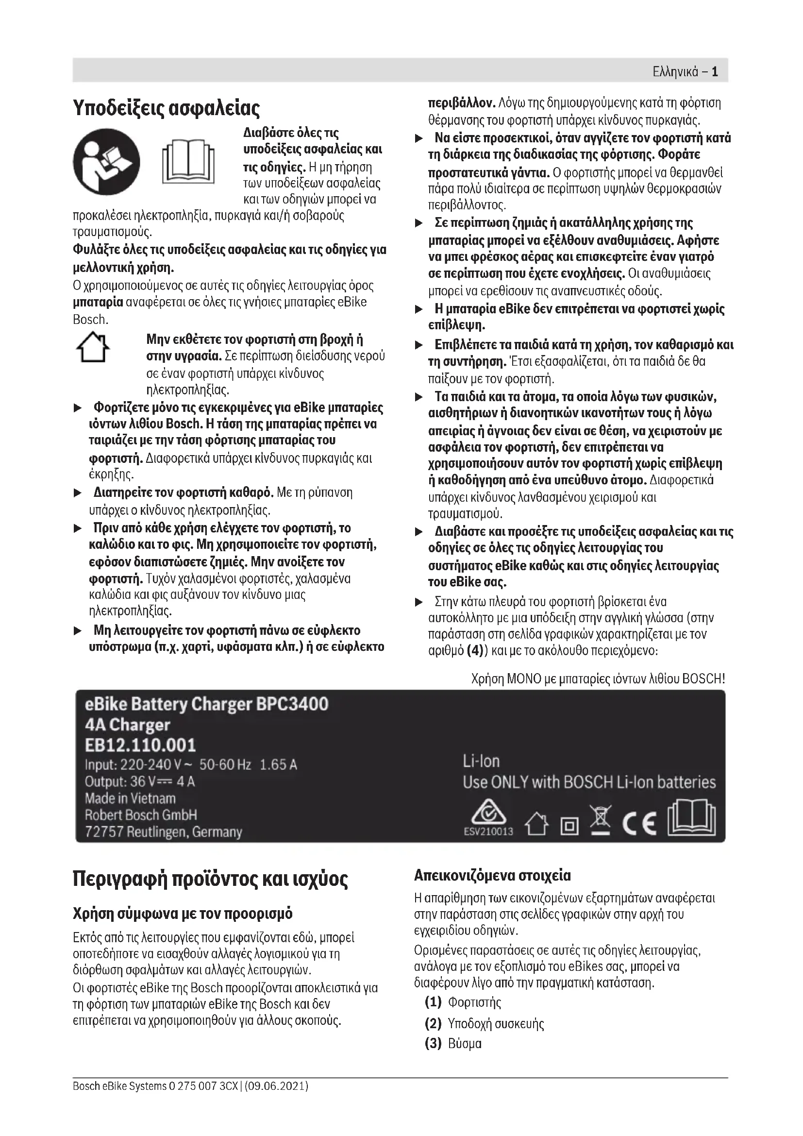 u Επιβλέπετε τα παιδιά κατά τη χρήση, τον καθαρισμό και τη συντήρηση. Έτσι εξασφαλίζεται, ότι τα παιδιά δε θα παίξουν με τον φορτιστή. u Τα παιδιά και τα άτομα, τα οποία λόγω των φυσικών, αισθητήριων ή διανοητικών ικανοτήτων τους ή λόγω απειρίας ή άγνοιας δεν είναι σε θέση, να χειριστούν με ασφάλεια τον φορτιστή, δεν επιτρέπεται να χρησιμοποιήσουν αυτόν τον φορτιστή χωρίς επίβλεψη ή καθοδήγηση από ένα υπεύθυνο άτομο. Διαφορετικά υπάρχει κίνδυνος λανθασμένου χειρισμού και τραυματισμού. u Διαβάστε και προσέξτε τις υποδείξεις ασφαλείας και τις οδηγίες σε όλες τις οδηγίες λειτουργίας του συστήματος eBike καθώς και στις οδηγίες λειτουργίας του eBike σας. u Στην κάτω πλευρά του φορτιστή βρίσκεται ένα αυτοκόλλητο με μια υπόδειξη στην αγγλική γλώσσα (στην παράσταση στη σελίδα γραφικών χαρακτηρίζεται με τον αριθμό(4)) και με το ακόλουθο περιεχόμενο: Χρήση ΜΟΝΟ με μπαταρίες ιόντων λιθίου BOSCH! Περιγραφή προϊόντος και ισχύος Χρήση σύμφωνα με τον προορισμό Εκτός από τις λειτουργίες που εμφανίζονται εδώ, μπορεί οποτεδήποτε να εισαχθούν αλλαγές λογισμικού για τη διόρθωση σφαλμάτων και αλλαγές λειτουργιών. Οι φορτιστές eBike της Bosch προορίζονται αποκλειστικά για τη φόρτιση των μπαταριών eBike της Bosch και δεν επιτρέπεται να χρησιμοποιηθούν για άλλους σκοπούς. Απεικονιζόμενα στοιχεία Η απαρίθμηση των εικονιζομένων εξαρτημάτων αναφέρεται στην παράσταση στις σελίδες γραφικών στην αρχή του εγχειριδίου οδηγιών. Ορισμένες παραστάσεις σε αυτές τις οδηγίες λειτουργίας, ανάλογα με τον εξοπλισμό του eBikes σας, μπορεί να διαφέρουν λίγο από την πραγματική κατάσταση. (1)