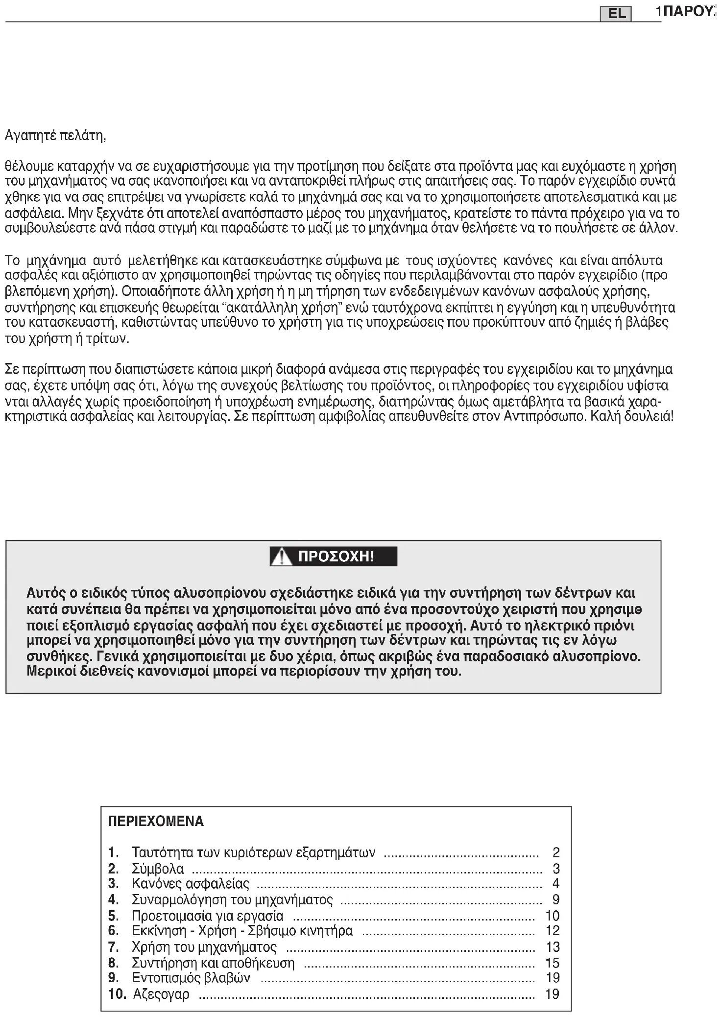 ποιεί εξοπλισμό εργασίας ασφαλή που έχει σχεδιαστεί με προσοχή. Αυτό το ηλεκτρικό πριόνι μπορεί να χρησιμοποιηθεί μόνο για την συντήρηση των δέντρων και τηρώντας τις εν λόγω συνθήκες. Γενικά χρησιμοποιείται με δυο χέρια, όπως ακριβώς ένα παραδοσιακό αλυσοπρίονο. Μερικοί διεθνείς κανονισμοί μπορεί να περιορίσουν την χρήση του. Αγαπητέ πελάτη, θέλουμε καταρχήν να σε ευχαριστήσουμε για την προτίμηση που δείξατε στα προϊόντα μας και ευχόμαστε η χρήση του μηχανήματος να σας ικανοποιήσει και να ανταποκριθεί πλήρως στις απαιτήσεις σας. Το παρόν εγχειρίδιο συντά