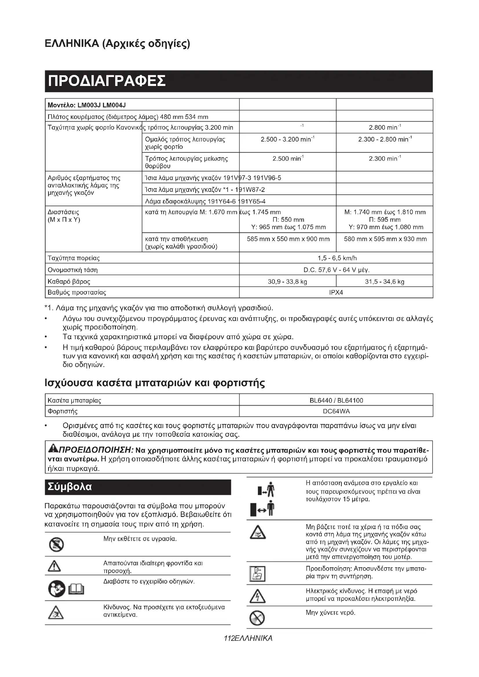 (Μ x Π x Υ) κατά τη λειτουργία Μ: 1.670 mm έως 1.745 mm Π: 550 mm Υ: 965 mm έως 1.075 mm Μ: 1.740 mm έως 1.810 mm Π: 595 mm Υ: 970 mm έως 1.080 mm κατά την αποθήκευση (χωρίς καλάθι γρασιδιού) 585 mm x 550 mm x 900 mm 580 mm x 595 mm x 930 mm Ταχύτητα πορείας 1,5 - 6,5 km/h Ονομαστική τάση D.C. 57,6 V - 64 V μέγ. Καθαρό βάρος 30,9 - 33,8 kg 31,5 - 34,6 kg Βαθμός προστασίας IPX4 *1. Λάμα της μηχανής γκαζόν για πιο αποδοτική συλλογή γρασιδιού.