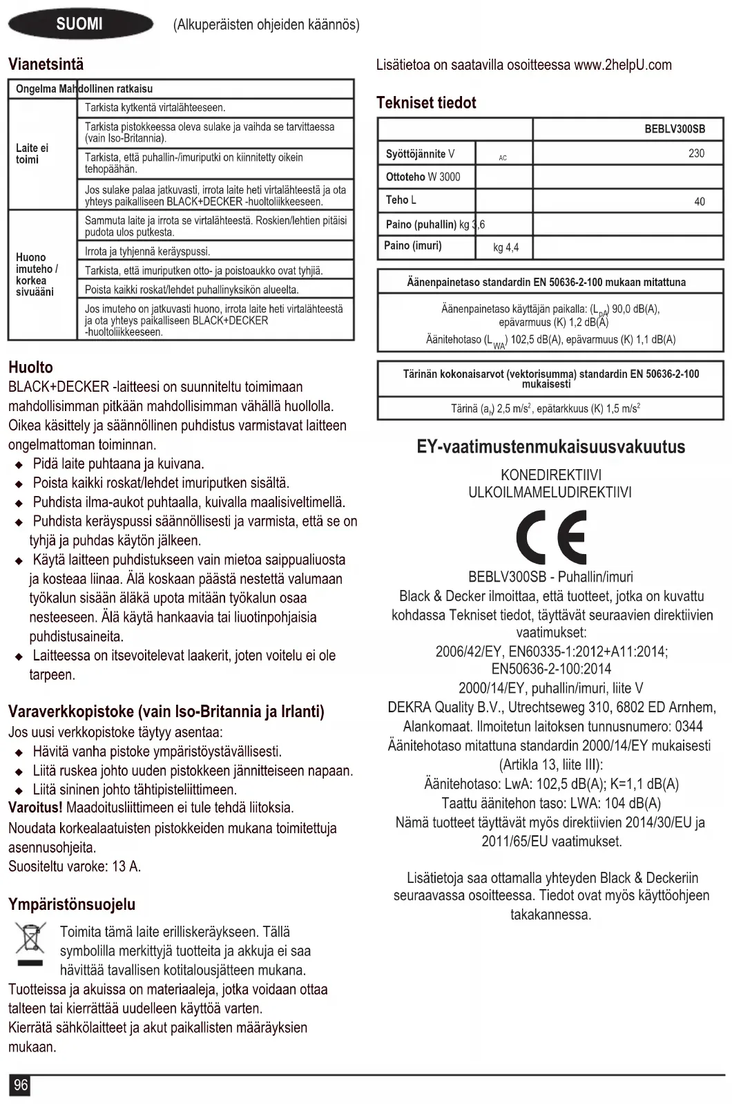 BEBLV300SB - Φυσητήρας/αναρροφητήρας Η Black & Decker δηλώνει ότι τα προϊόντα αυτά που περιγράφονται στα "τεχνικά χαρακτηριστικά" συμμορφώνονται με τα ακόλουθα: 2006/42/ΕΚ, EN60335-1:2012+A11:2014, EN50636-2-100:2014 2000/14/ΕΚ, Φυσητήρας/Αναρροφητήρας, Παράρτημα V DEKRA Quality B.V., Utrechtseweg 310, 6802 ED Arnhem, Ολλανδία Αρ. ID Διακοινωμένου Οργανισμού: 0344 Στάθμη ηχητικής ισχύος σύμφωνα με 2000/14/EΚ (Άρθρο 13, Παράρτημα III): Στάθμη ηχητικής ισχύος: LwA: 102,5 dB(A), K=1,1 dB(A) Εγγυημένη στάθμη ηχητικής ισχύος: LWA: 104 dB(A) Αυτά τα προϊόντα συμμορφώνονται και με την Οδηγία 2014/30/ΕΕ και 2011/65/ΕΕ. Για περισσότερες πληροφορίες, επικοινωνήστε με την Black & Decker στην παρακάτω διεύθυνση ή ανατρέξτε στο πίσω μέρος του εγχειριδίου. Ο κάτωθι υπογεγραμμένος είναι υπεύθυνος για την κατάρτιση του τεχνικού φακέλου και κάνει αυτή τη δήλωση για λογαριασμό της Black & Decker. Patrick Diepenbach General Manager, Benelux Black and Decker, Egide Walschaertsstraat 14-18 2800 Mechelen, Belgium