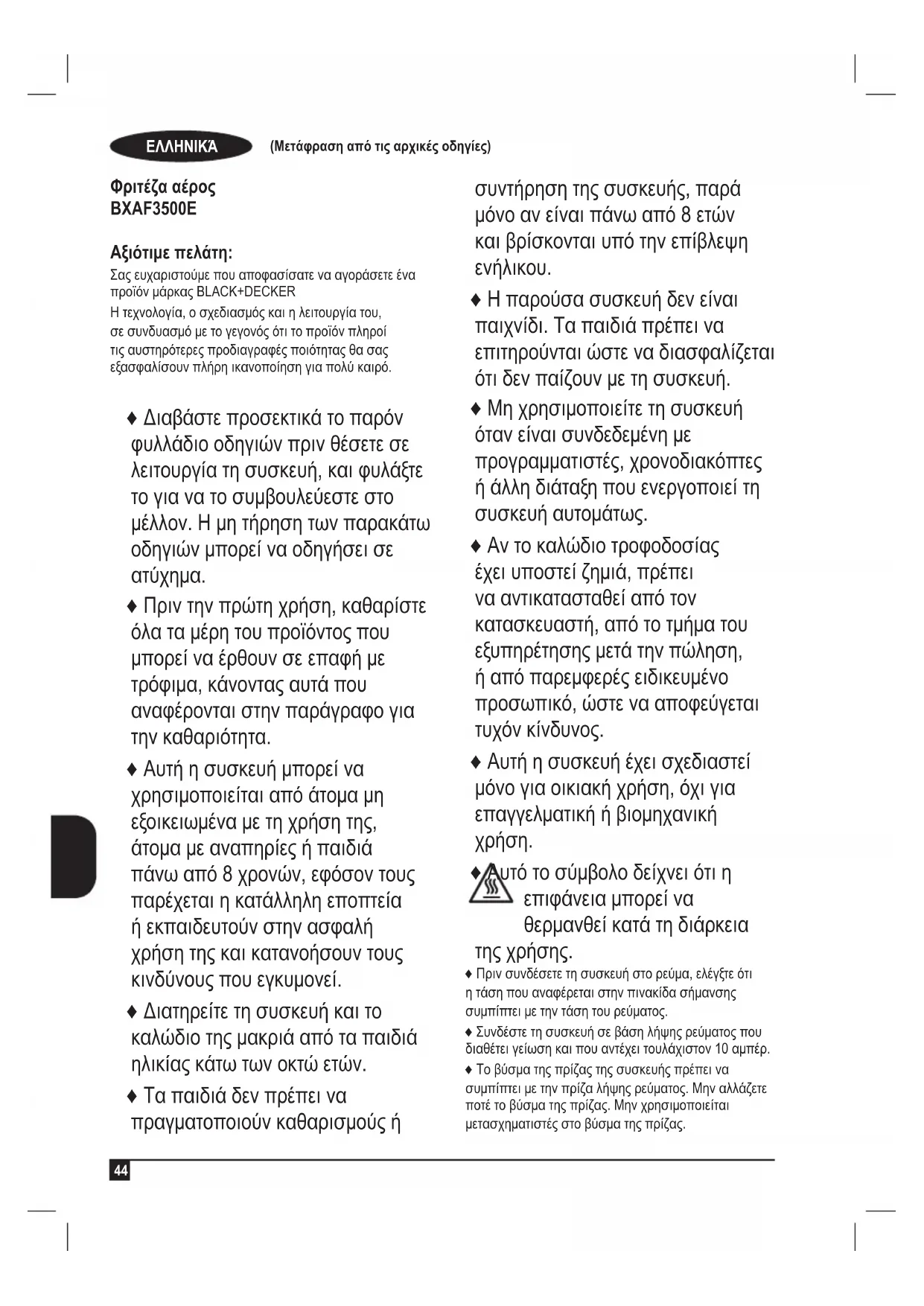 Φριτέζα αέρος BXAF3500E Αξιότιμε πελάτη: Σας ευχαριστούμε που αποφασίσατε να αγοράσετε ένα προϊόν μάρκας BLACK+DECKER Η τεχνολογία, ο σχεδιασμός και η λειτουργία του, σε συνδυασμό με το γεγονός ότι το προϊόν πληροί τις αυστηρότερες προδιαγραφές ποιότητας θα σας εξασφαλίσουν πλήρη ικανοποίηση για πολύ καιρό. ♦ Διαβάστε προσεκτικά το παρόν φυλλάδιο οδηγιών πριν θέσετε σε λειτουργία τη συσκευή, και φυλάξτε το για να το συμβουλεύεστε στο μέλλον. Η μη τήρηση των παρακάτω οδηγιών μπορεί να οδηγήσει σε